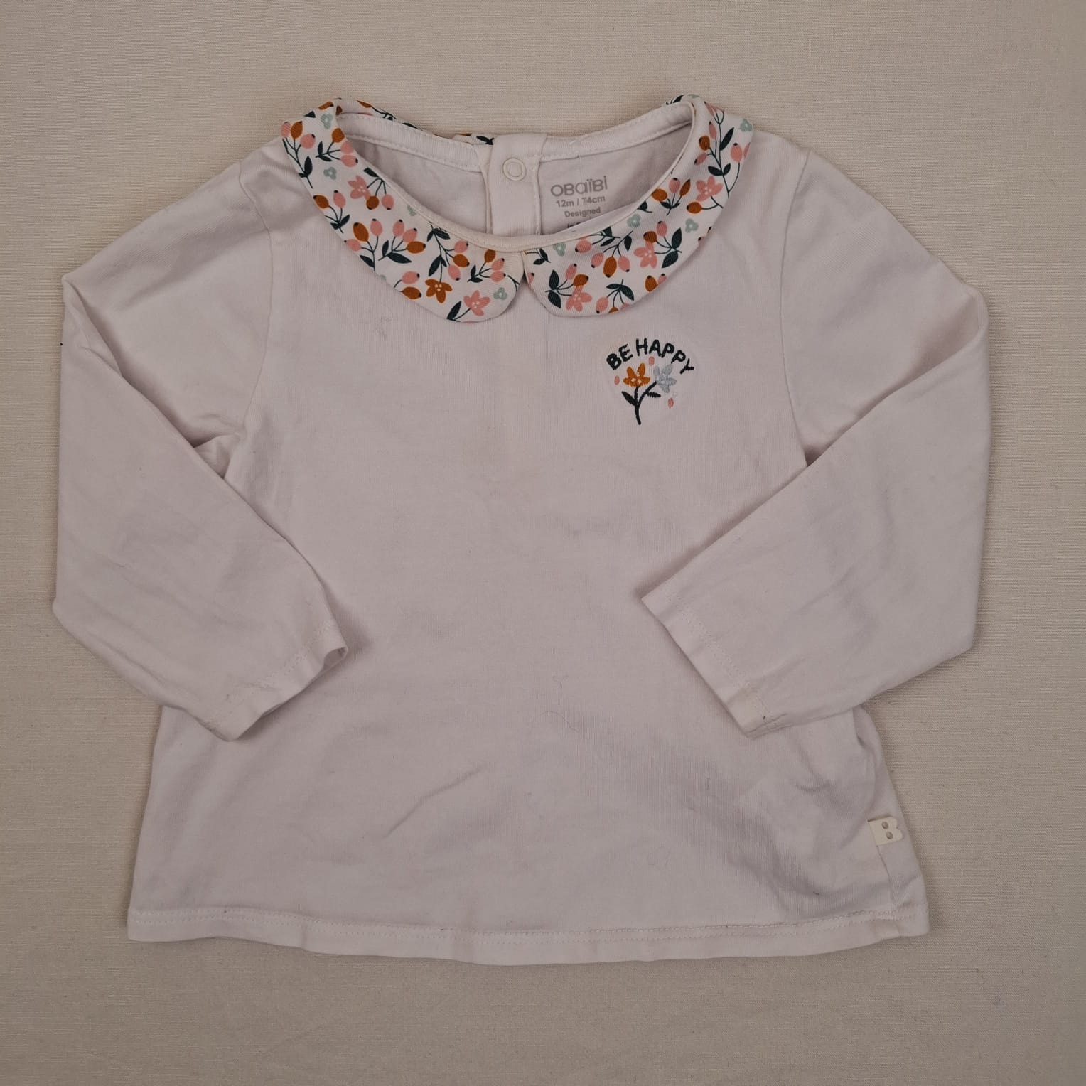 Autres commentaires : 5% élasthanne. T-shirt blanc à manches longues, col Claudine avec motif floral, inscription « BE HAPPY » à l’avant gauche, fermeture par boutons au dos.