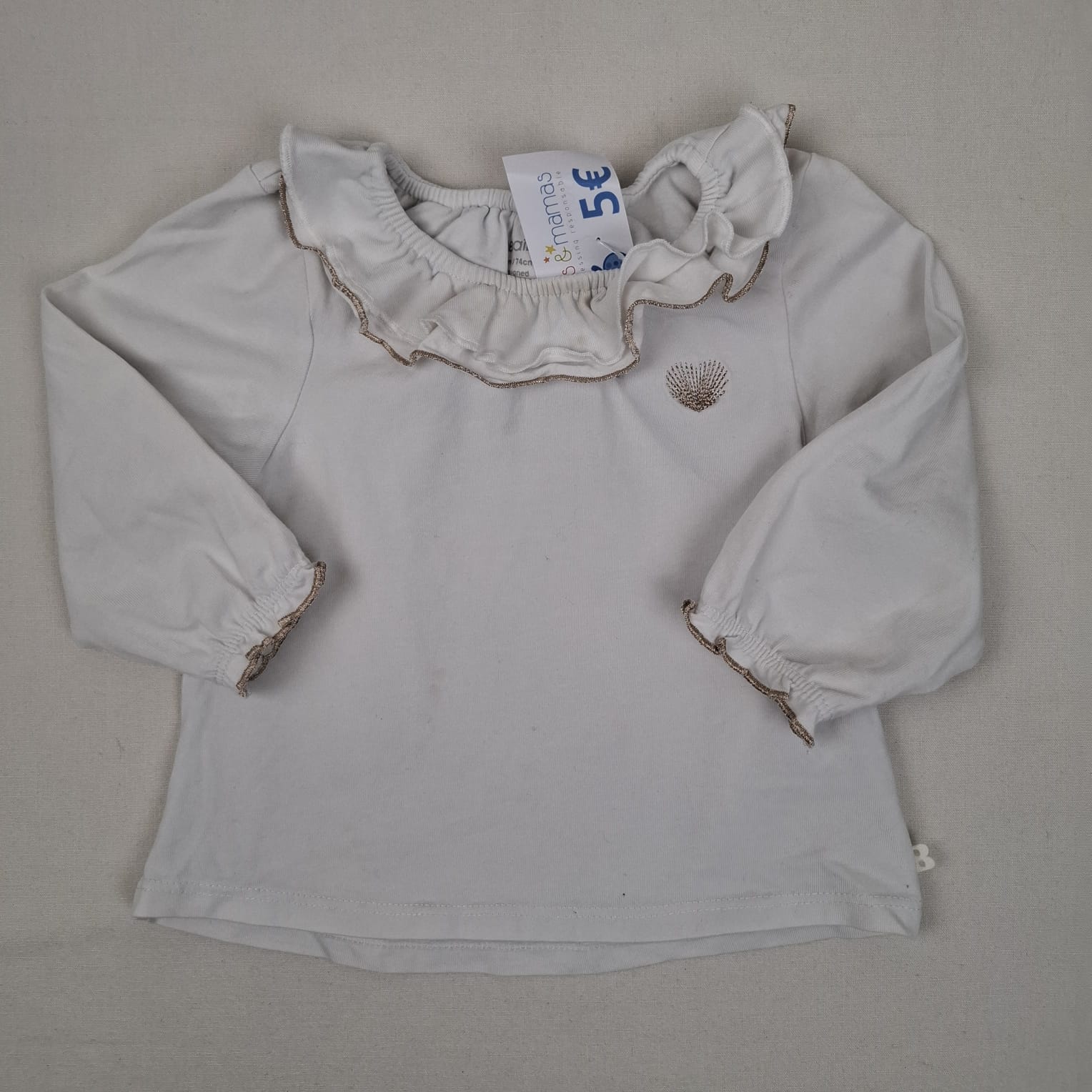 Autres commentaires : 5% élasthanne. T-shirt blanc à manches longues, col collerette et poignets élastiqués, motif coeur à l’avant gauche, petites taches sur le col à l’avant.