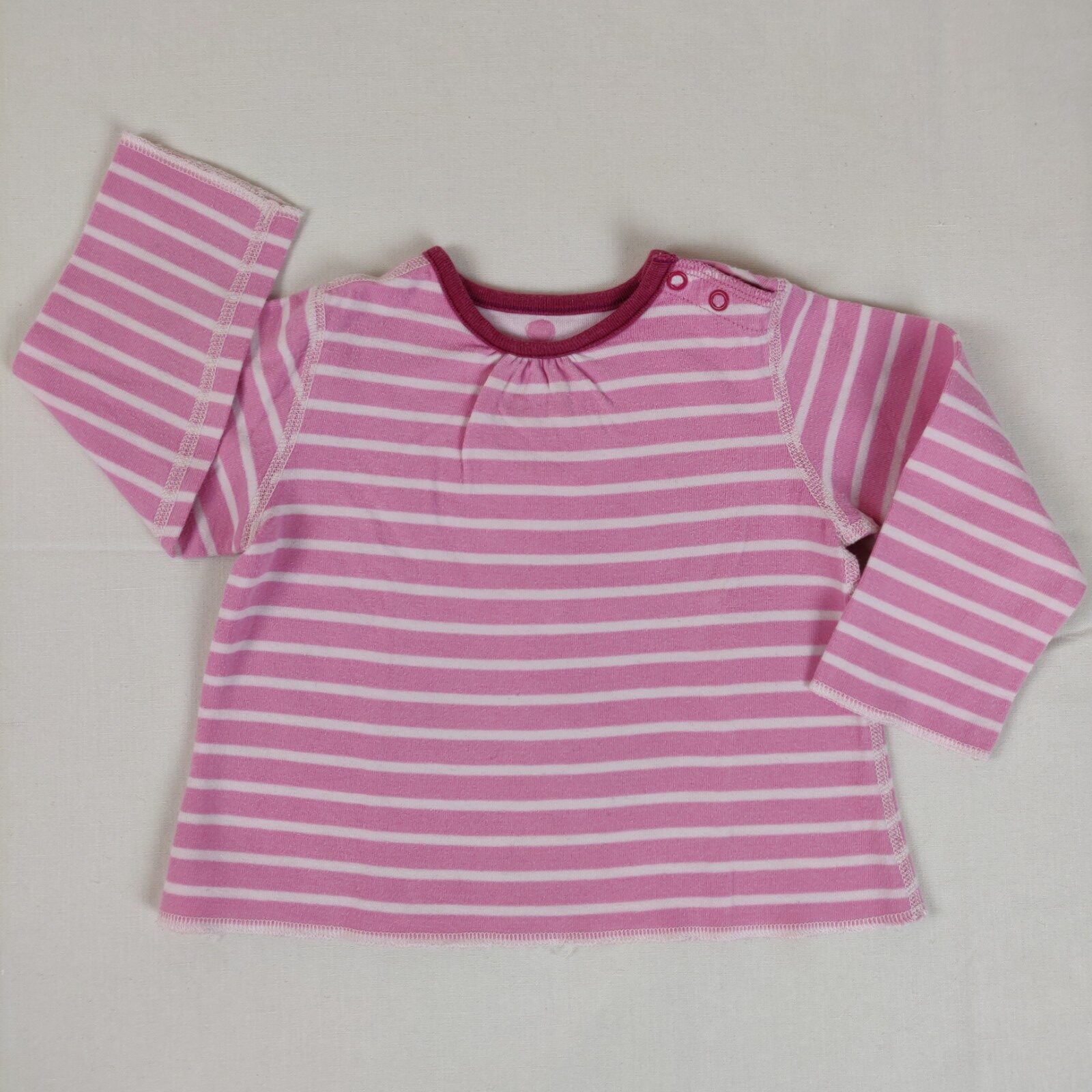 Autres commentaires : T-shirt manches longues – rose à fines rayures horizontales blanches. Col rond prune. Ouverture latérale à 2 boutons pression. Coutures apparentes blanches. Très léger effet pelucheux.