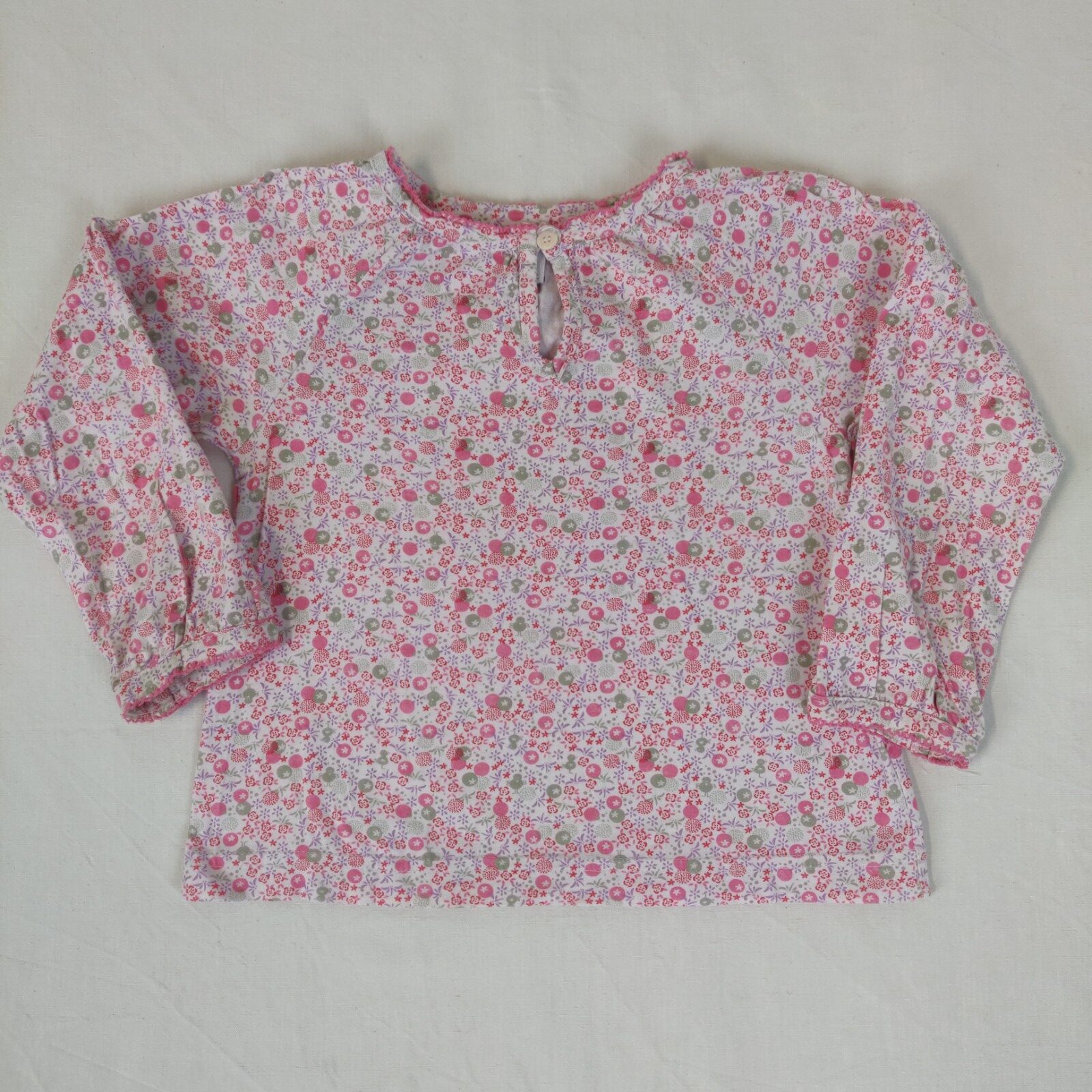 Autres commentaires : T-shirt à manches longues – blanc avec motifs floraux roses, rouges, verts et violets. Ouverture centrale à un bouton.