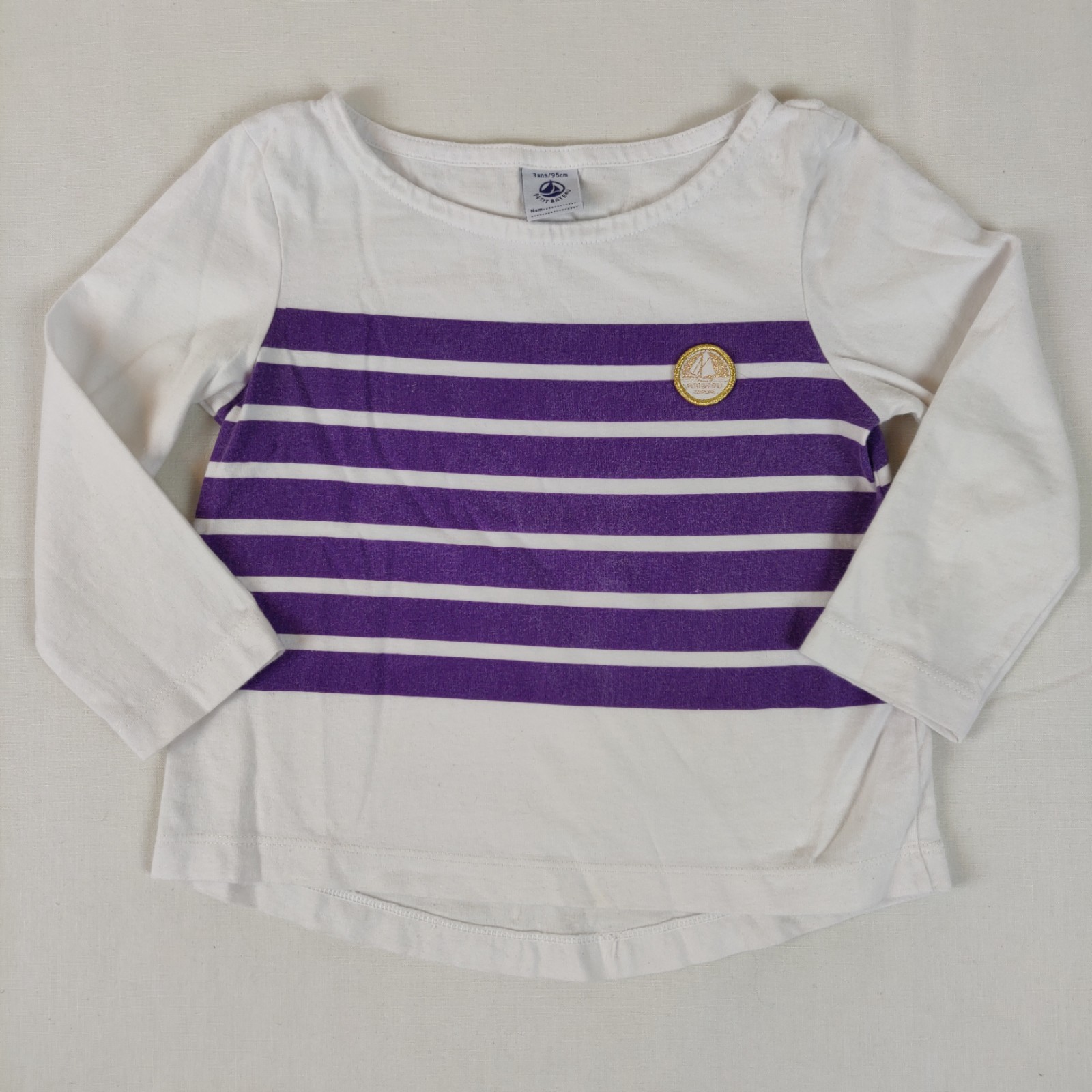 Autres commentaires : T-shirt manches longues blanc à rayures violettes, col bateau. Ecusson Petit Bateau blanc et doré brodé sur le coeur. Légères traces d’usage.