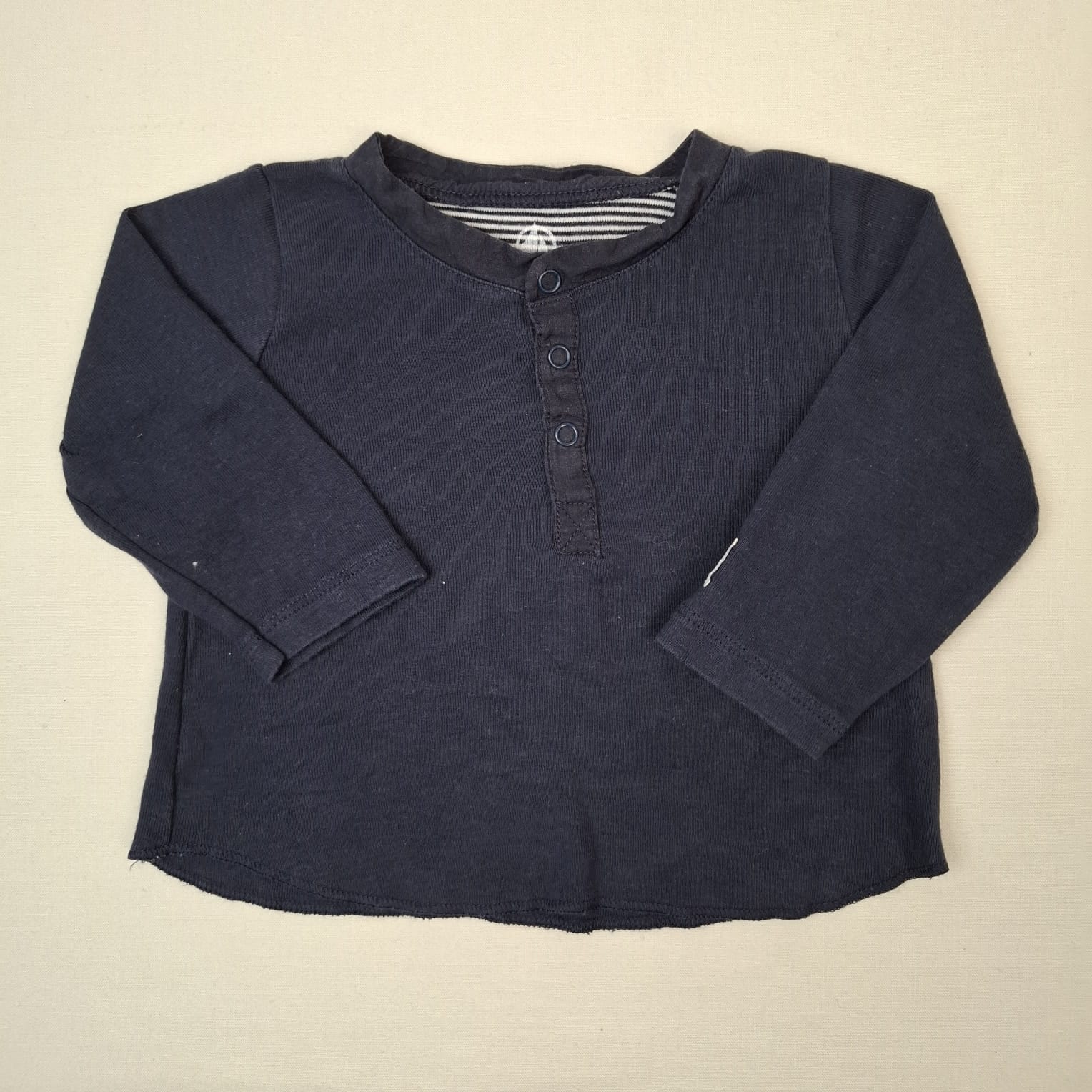 Autres commentaires : T-shirt uni manches longues bleu nuit, col rond fermé avec trois boutons pression devant.