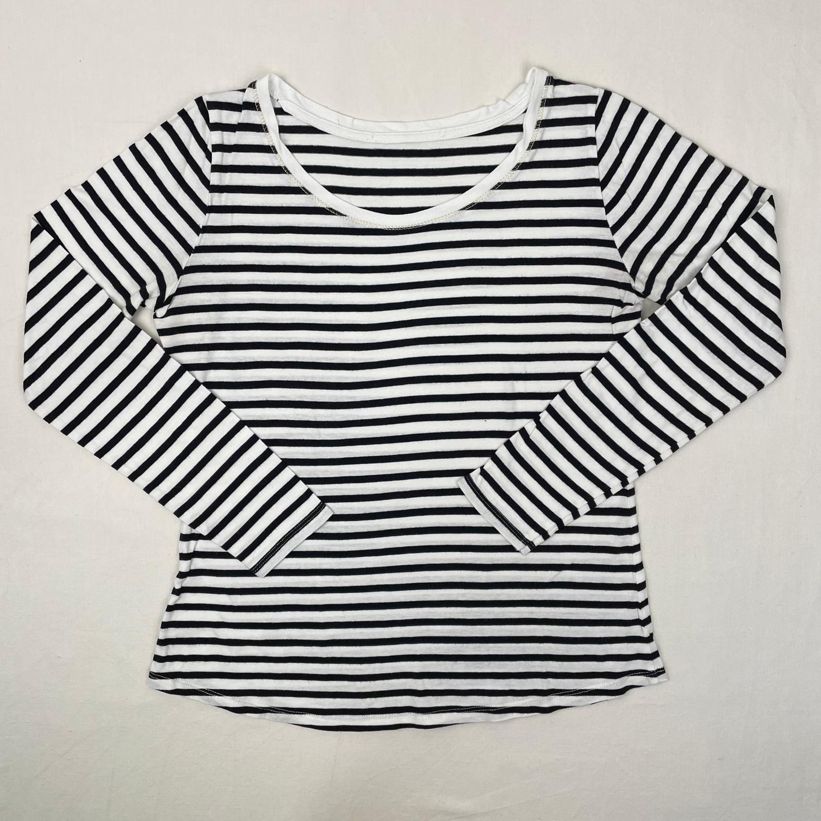Autres commentaires : T-shirt fin manches longues, blanc à rayures bleu marine, style marinière, encolure large et arrondie, surcoutures dorées. Taille estimée 12A.