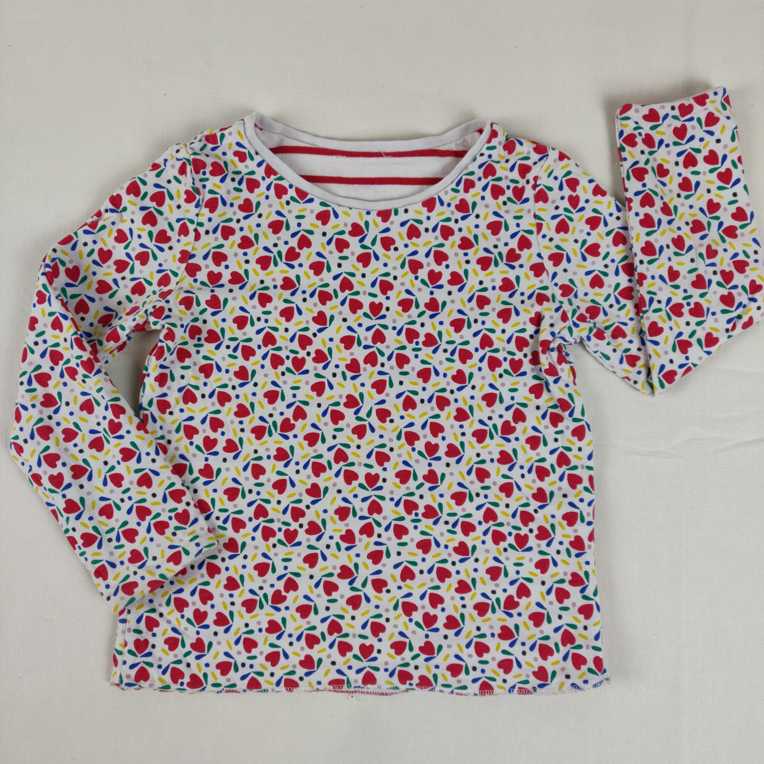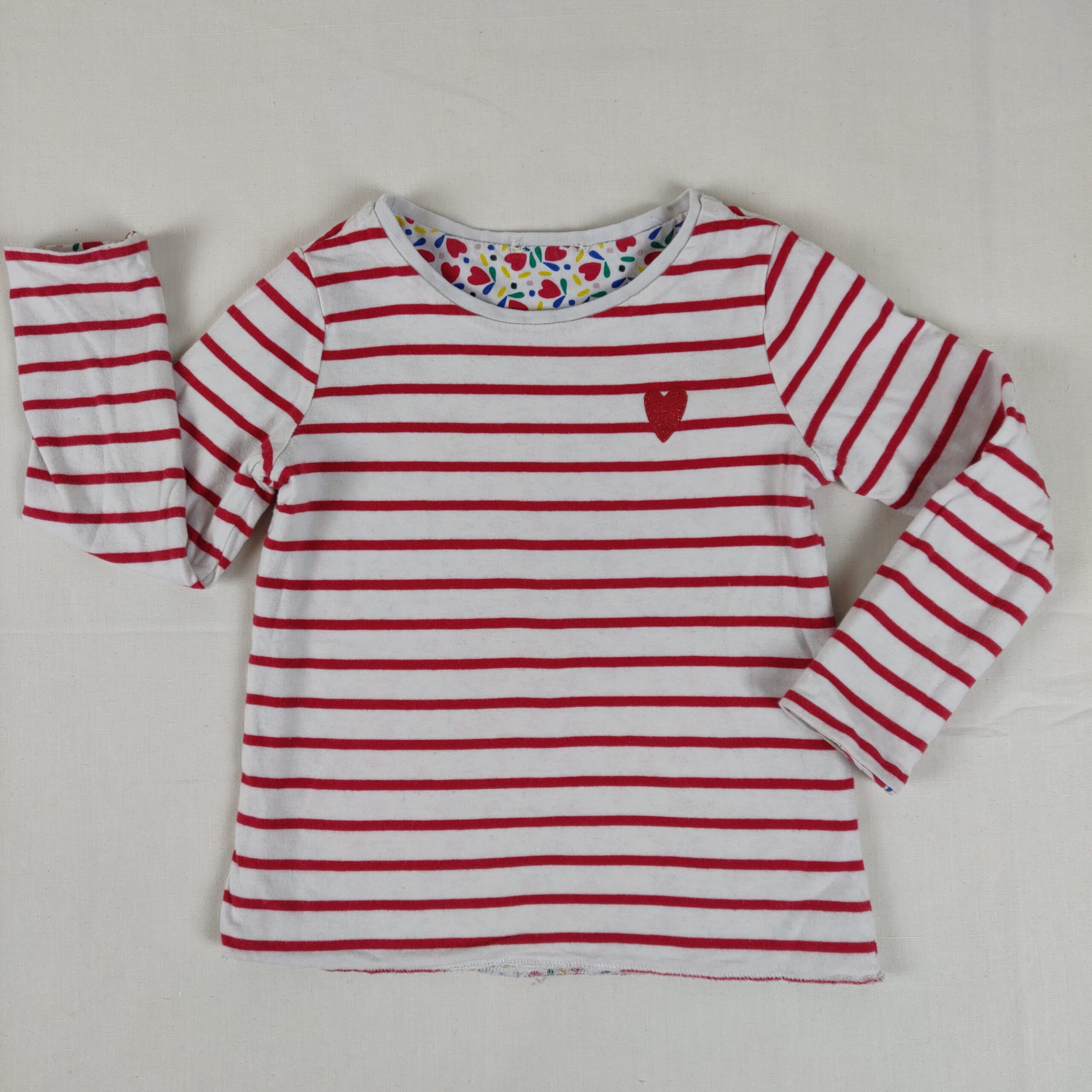 Autres commentaires : probablement coton majoritaire – Marinière réversible manches longues de couleur rouge et blanche, col légèrement bateau, avec motif coeur rouge pailleté,doublure réversible fond blanc et motif coeurs rouges et confettis mulicolores.