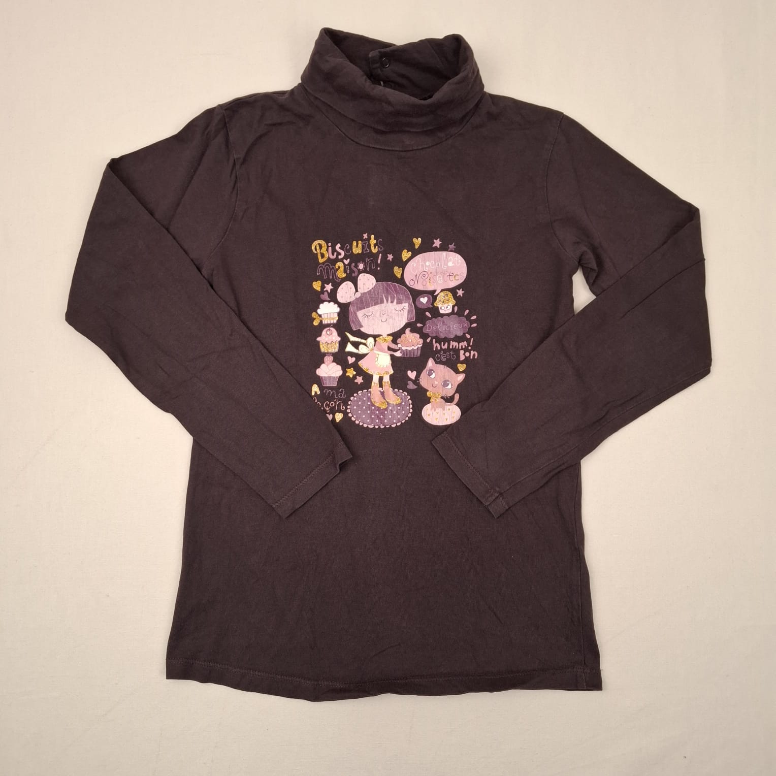 Autres commentaires : T-shirt marron foncé uni à manches longues, motif fille et chat, col roulé, fermeture par boutons pression au dos.