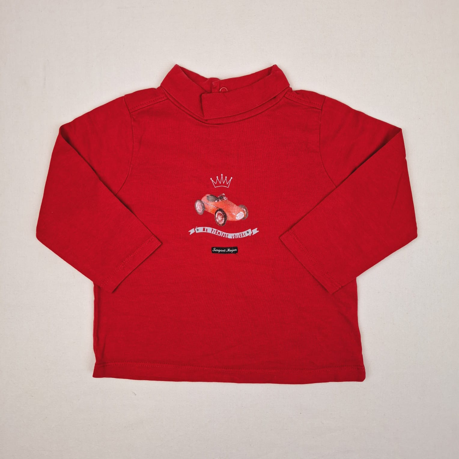Autres commentaires : T-shirt rouge à manches longues, motif voiture et inscription « Ma première voiture », col roulé, fermeture par boutons pression au dos.