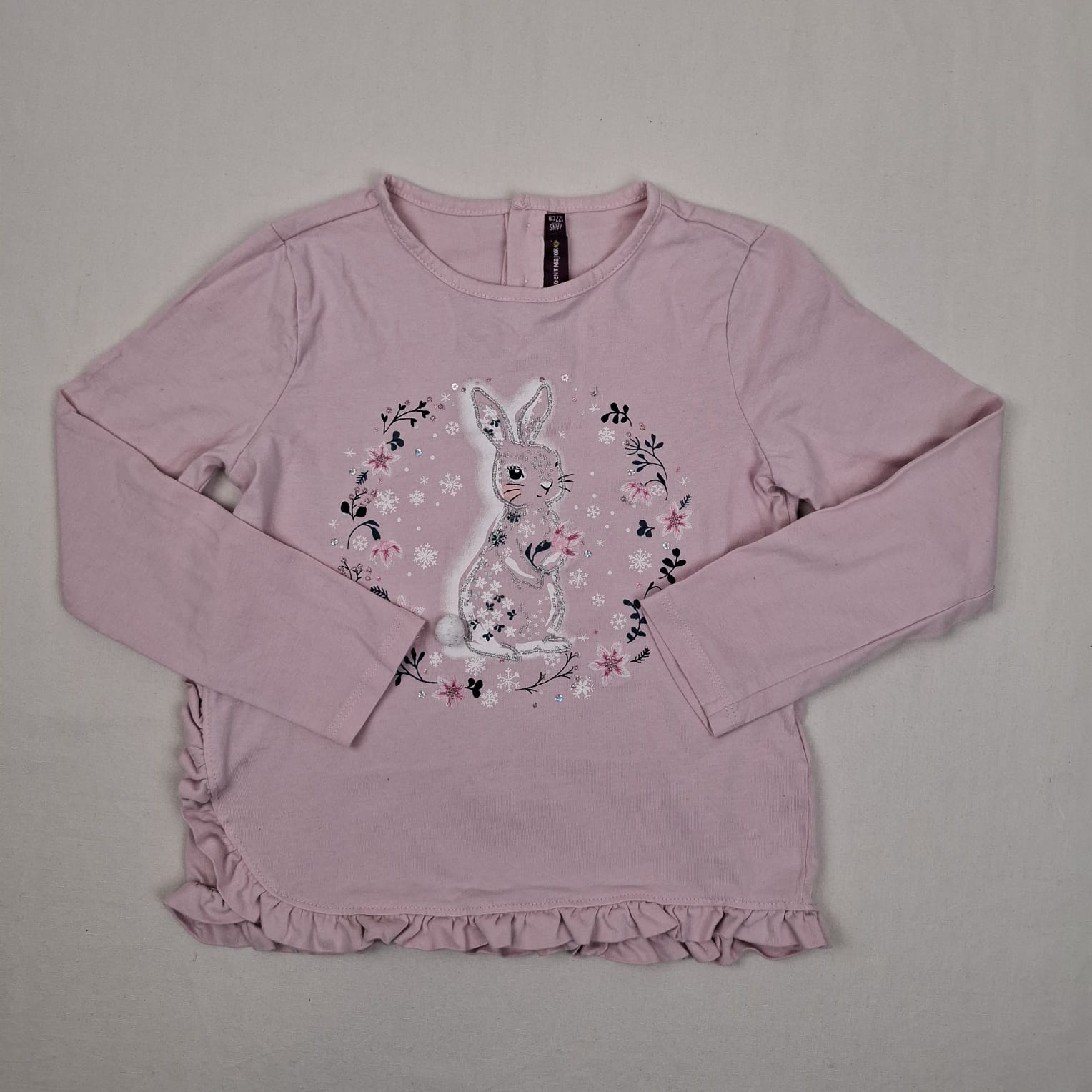 Autres commentaires : T-shirt rose à manches longues, motif lapin, col rond, fermeture par boutons au dos, bas avec volant