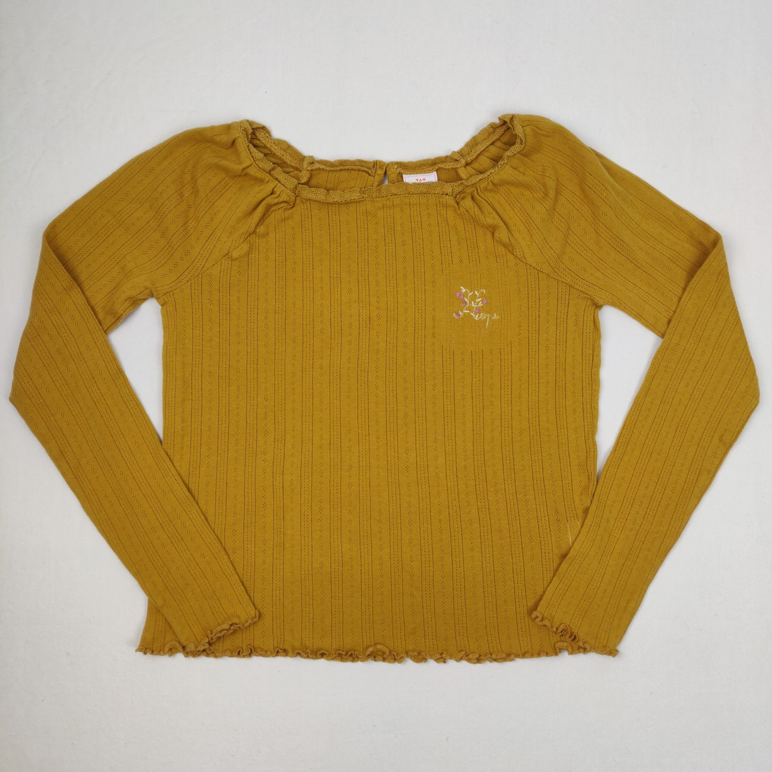 Autres commentaires : T-shirt à manches longues moutarde, fermeture par bouton au dos, col rond