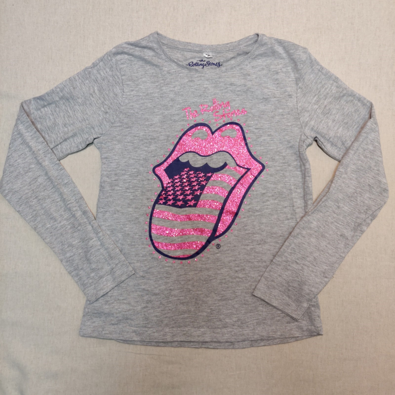 Autres commentaires : 5% viscose. T-shirt de la marque officielle The Rolling Stones. Gris, logo rose et bleu marine floqué.