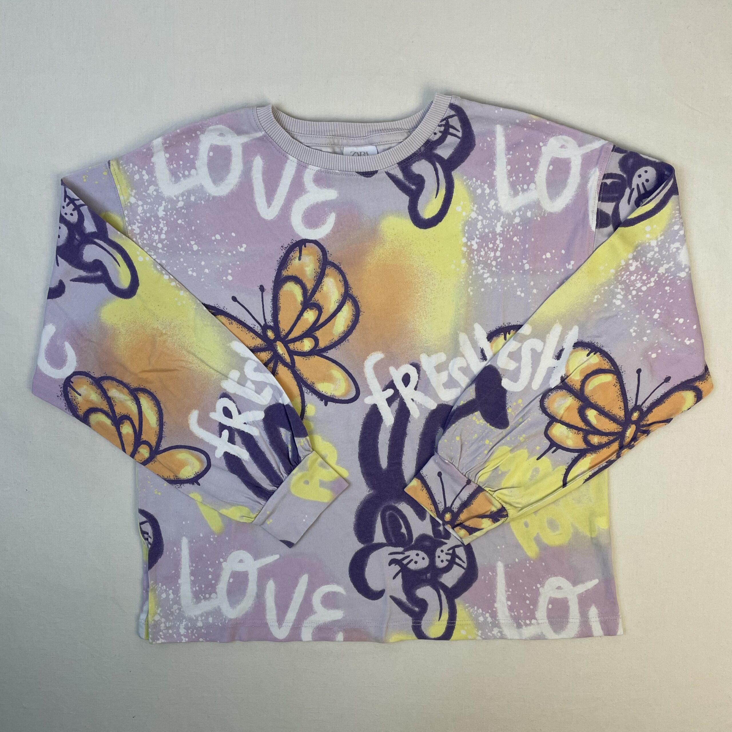 - T-shirt mauve parsemé de tags colorés de lapin, papillon, etc., assez court et et un peu oversize.