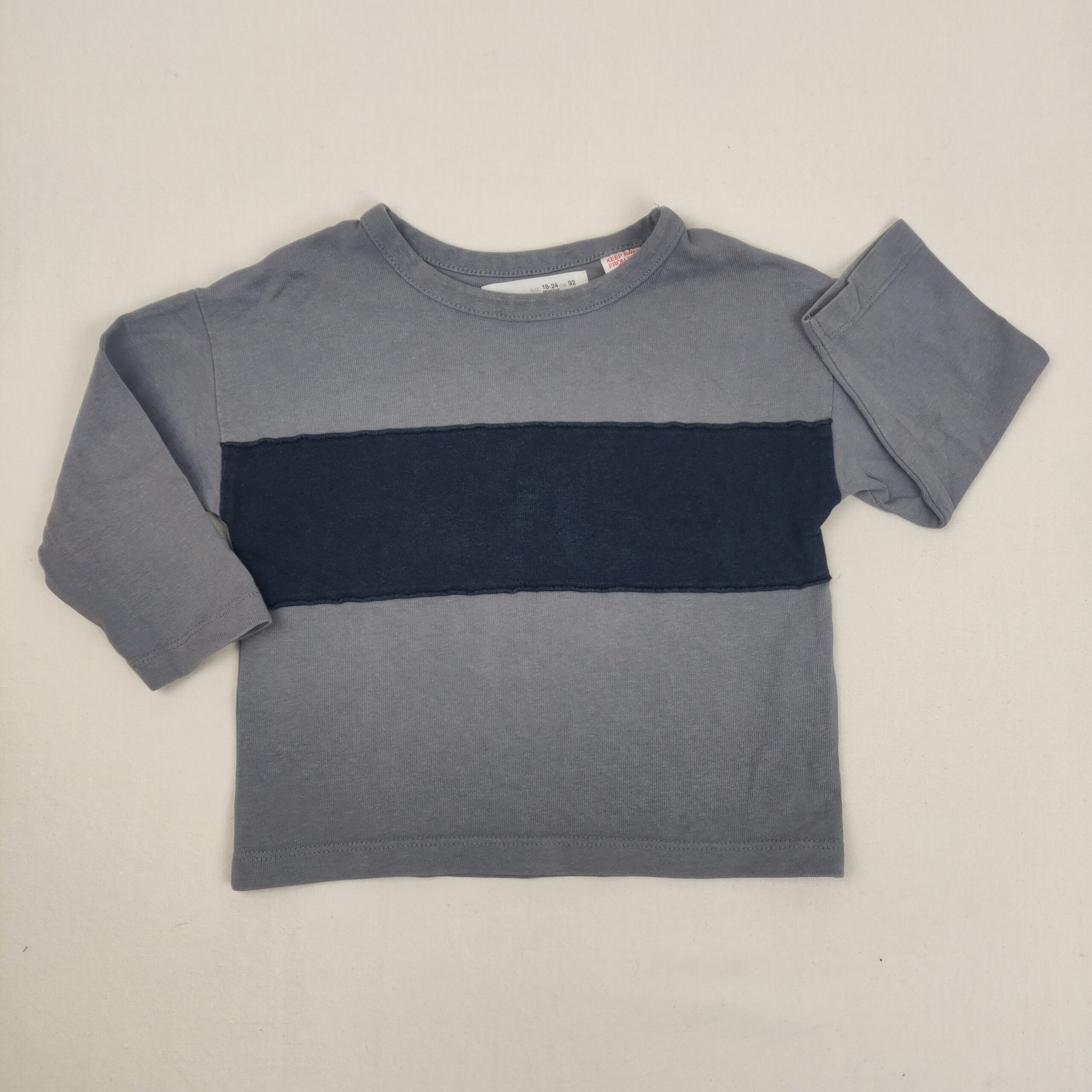 Autres commentaires : T-shirt manches longues gris à bande bleu marine, col rond, matière jersey.