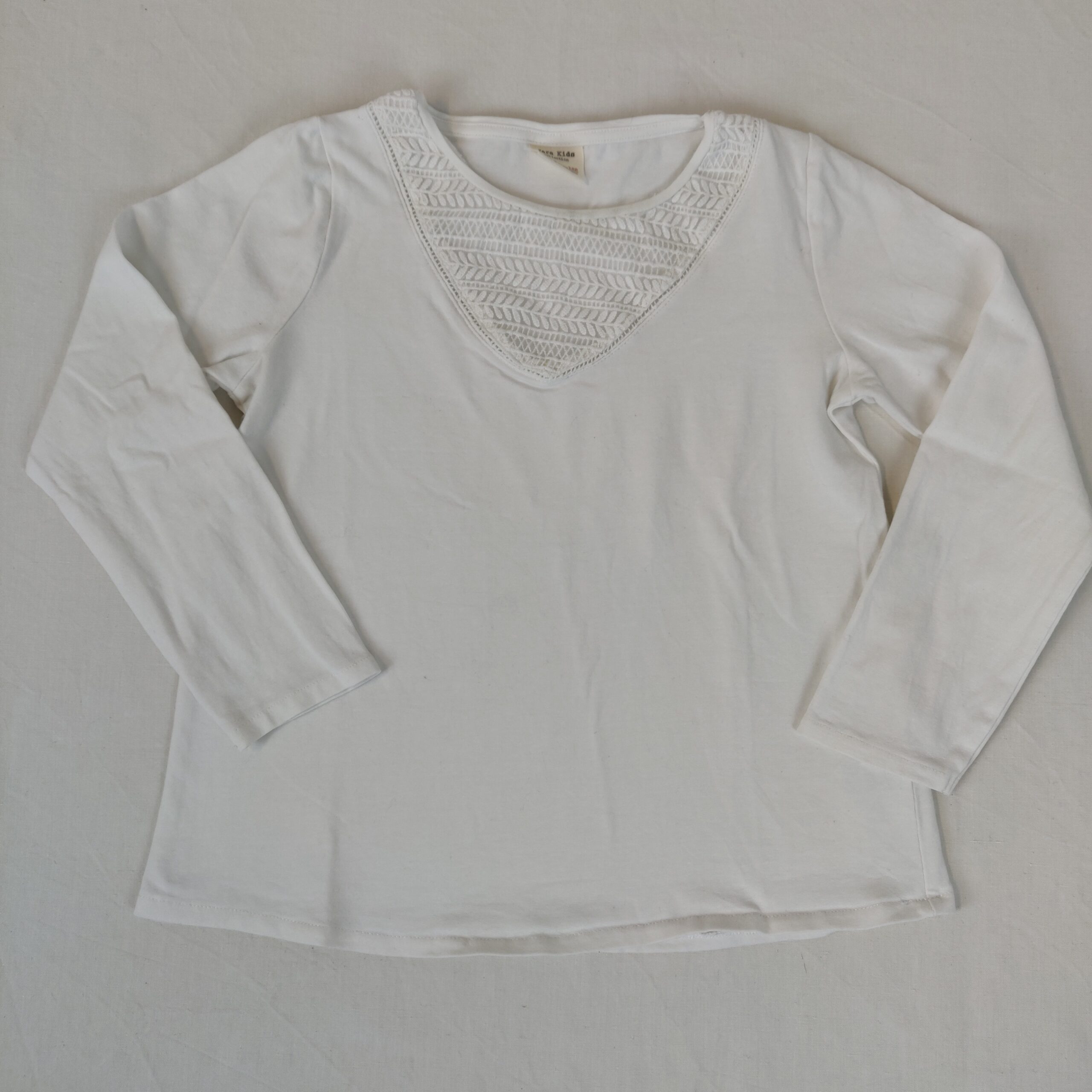 Autres commentaires : 5% élasthanne. T-shirt à manches longues – blanc cassé. Partie centrale à motifs géométriques en dentelle. Petite tâche discrète au niveau du col.