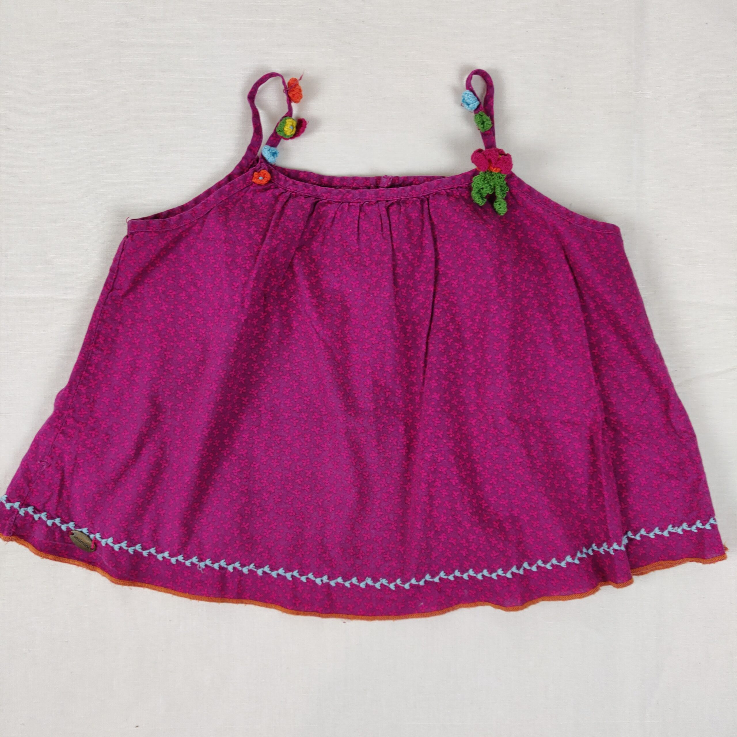 Autres commentaires : T-shirt à bretelles avec fleurs brodées. Tissu violet à mini fleurs roses fuschia, liseré bleu clair et couture du bas orange. Fermeture par un bouton en nacre au dos.