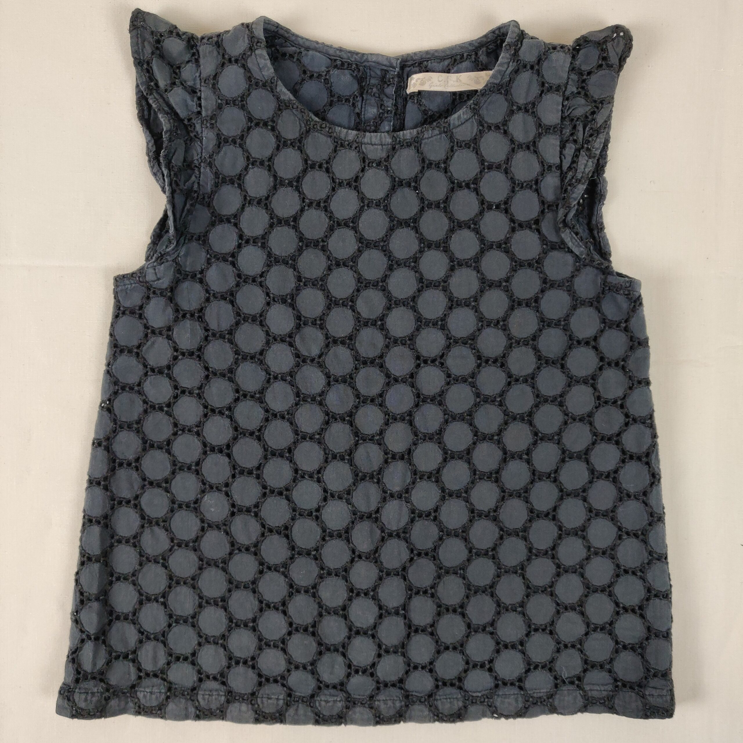 Autres commentaires : Haut anthracite alvéolé et dentelle avec volants aux emmanchures – doublure noire – fermeture haut du dos par boutonnière 2 boutons