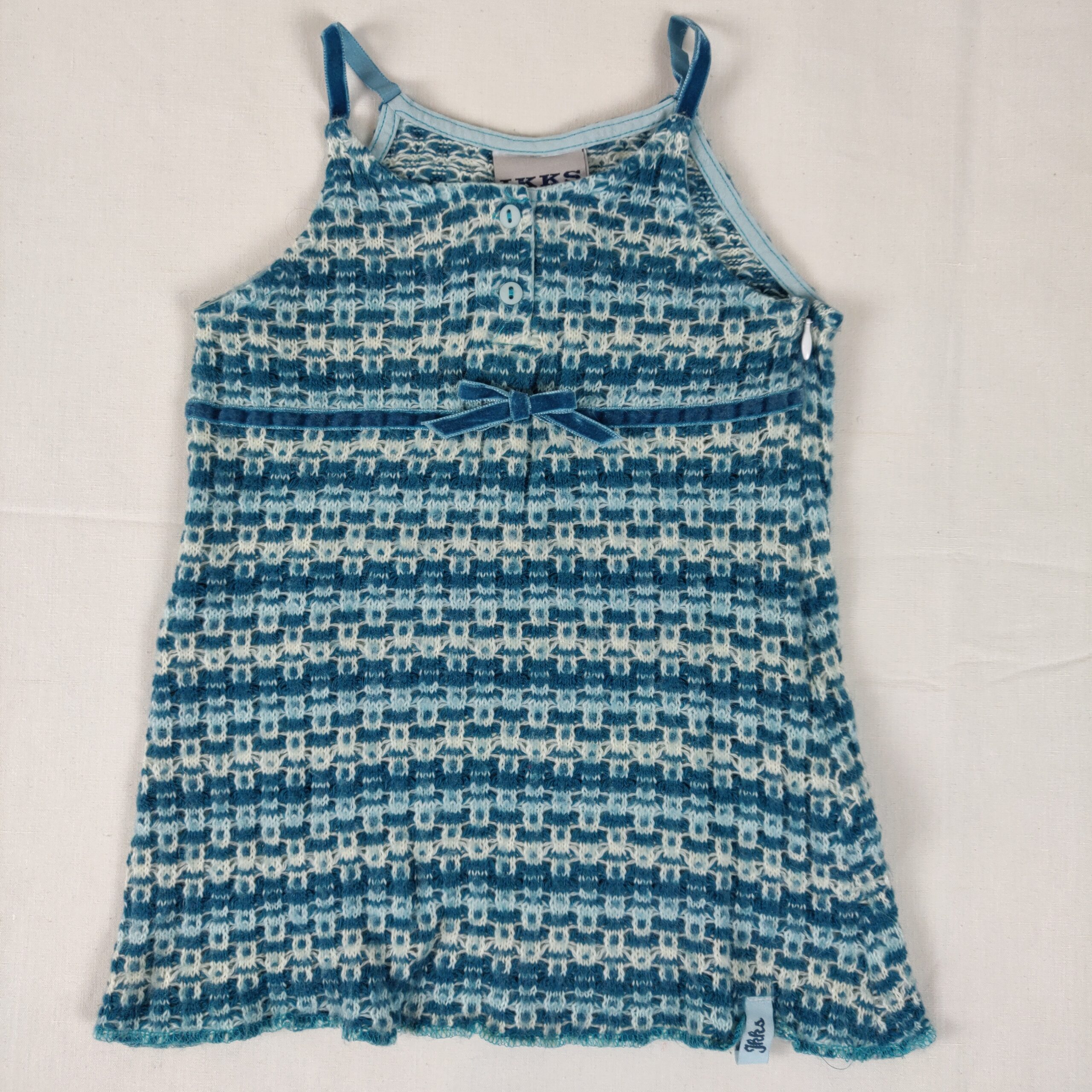 Autres commentaires : 20% Mohair. Débardeur en maille à lignes horizontales – bleu foncé, vert bleu et blanc – Bretelles et noeud central en velours. Petite échancrure sur le milieu du col avec deux boutons classiques.