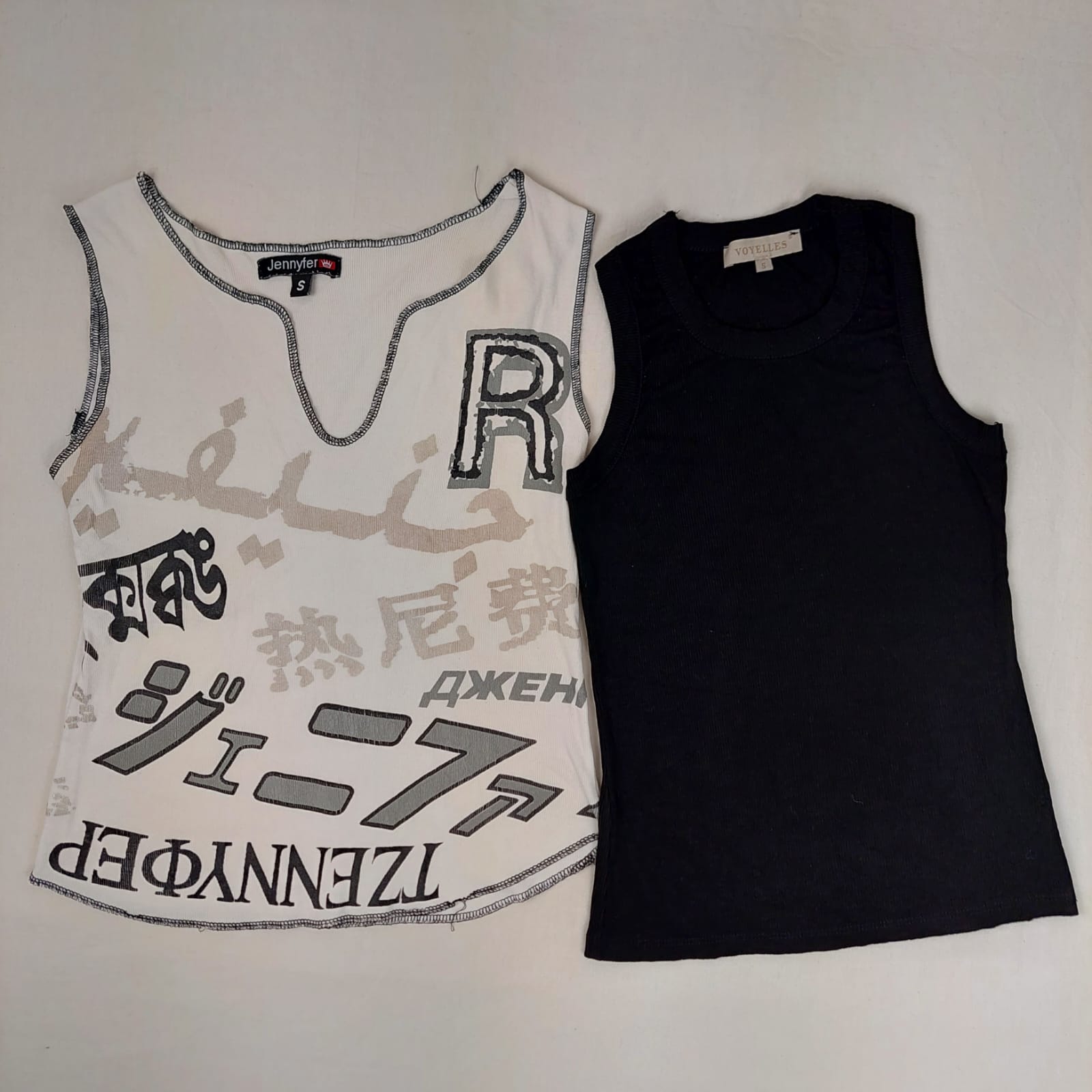 Autres commentaires : Lot 2 t-shirt sans manches, un Jennyfer blanc imprimé en différente langue, couture noire, un Voyelles noir uni