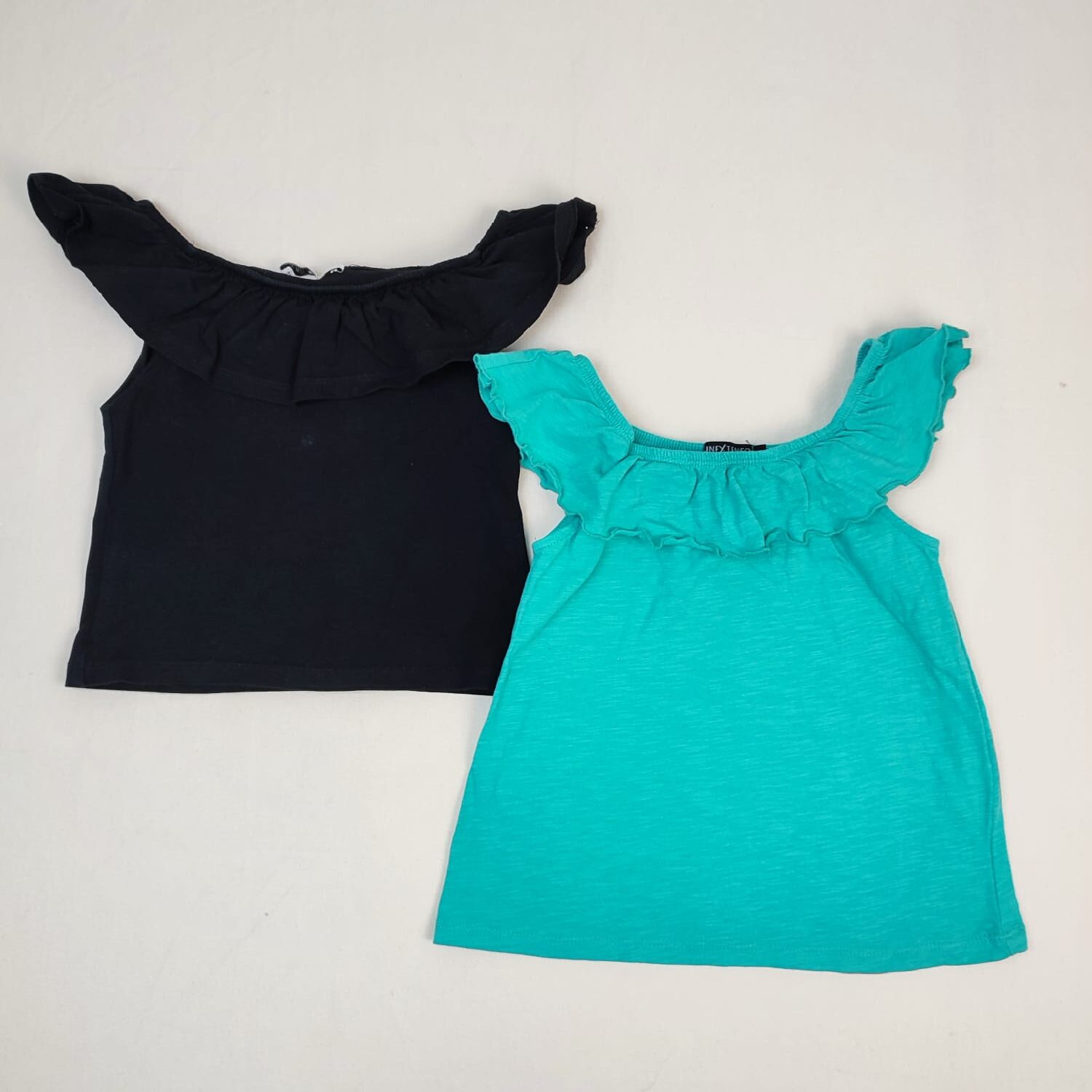 Autres commentaires : Lot de 2 T-shirts sans manches : – 1 noir Marks&Spencer, col collerette élastiqué, 96% coton et 4% élasthanne. – 1 vert turquoise IN EXTENSO, col collerette, 100% coton.