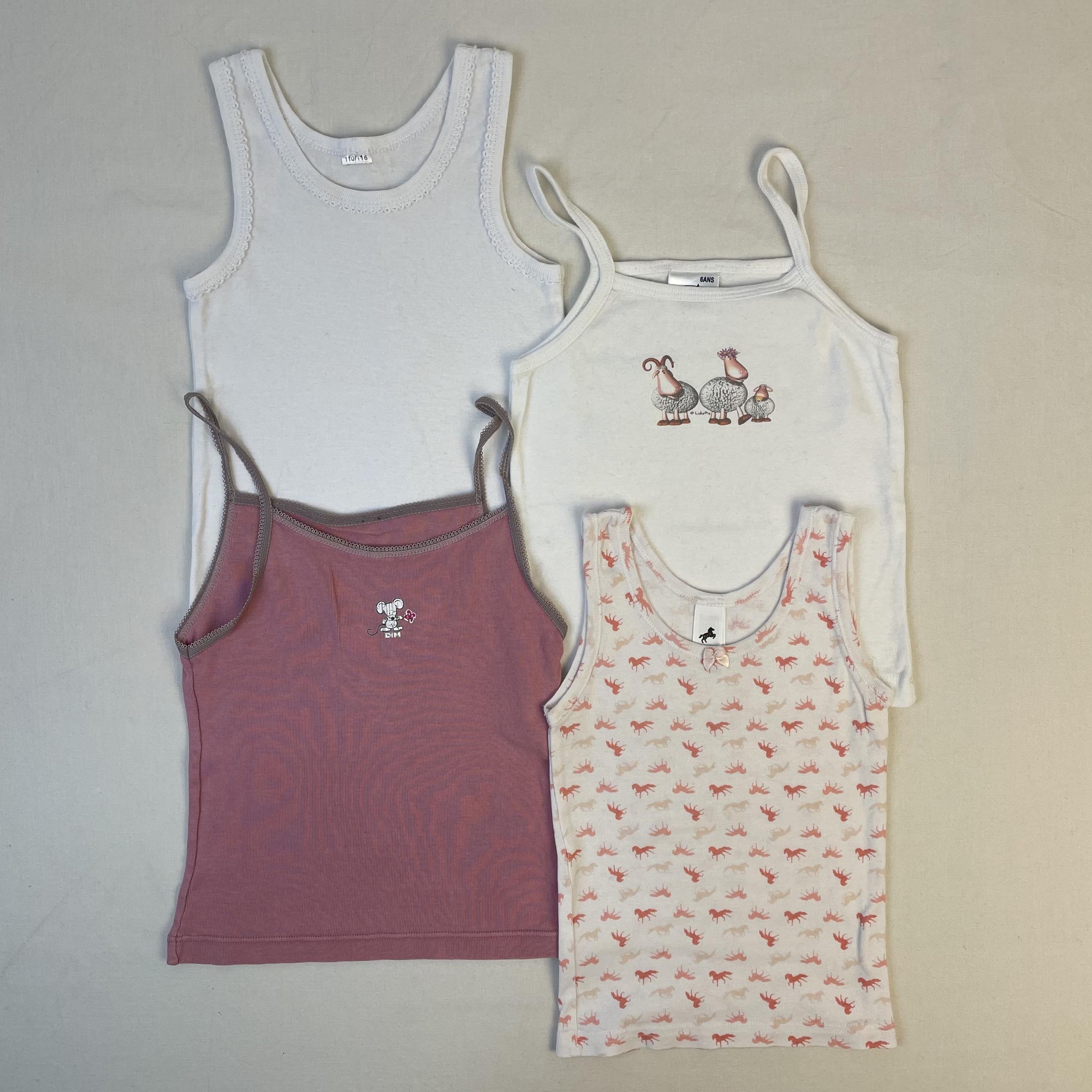 - Lot de 4 maillots de corps sans manches : – un débardeur C&A, blanc parsemé de mini chevaux rose orangé, 100% coton bio. – Un rose Dim à bretelles, petite souris blanche devant un peu craquelée. – un blanc à bretelles Cotton Made, devant motif famille de moutons, en 100% coton peigné. – un débardeur uni blanc sans marque, bordures dentelées.