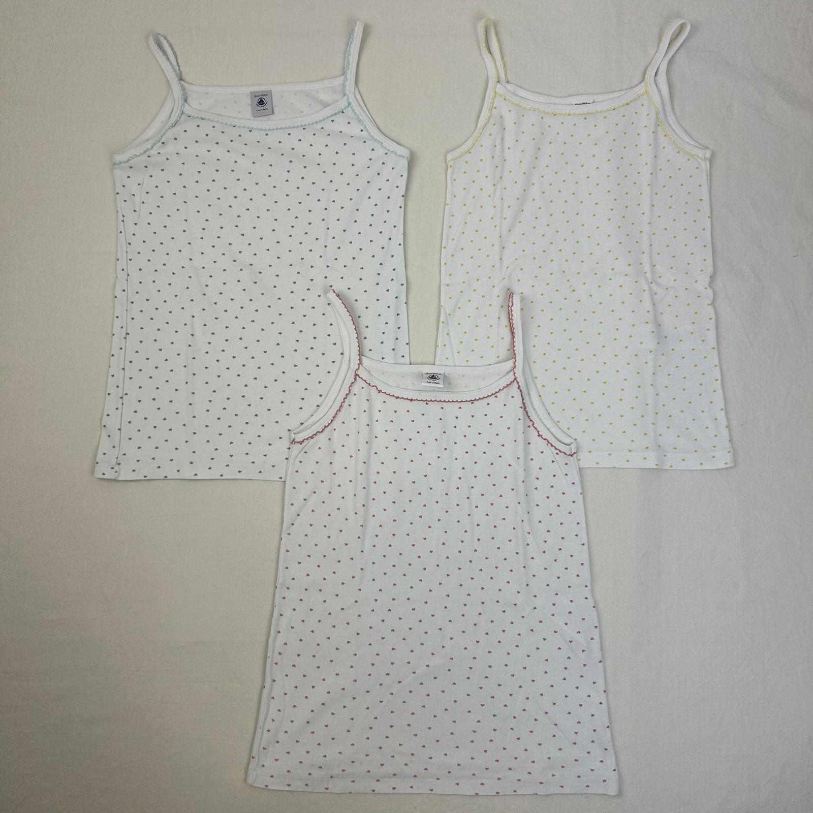 Autres commentaires : Lot de 3 débardeurs Petit Bateau , col rond, blanc, avec des motifs de coeur sur tout les vêtements:- T-shirt avec motifs rose. -T-shirt avec motifs jaune. -T-shirt avec motifs vert