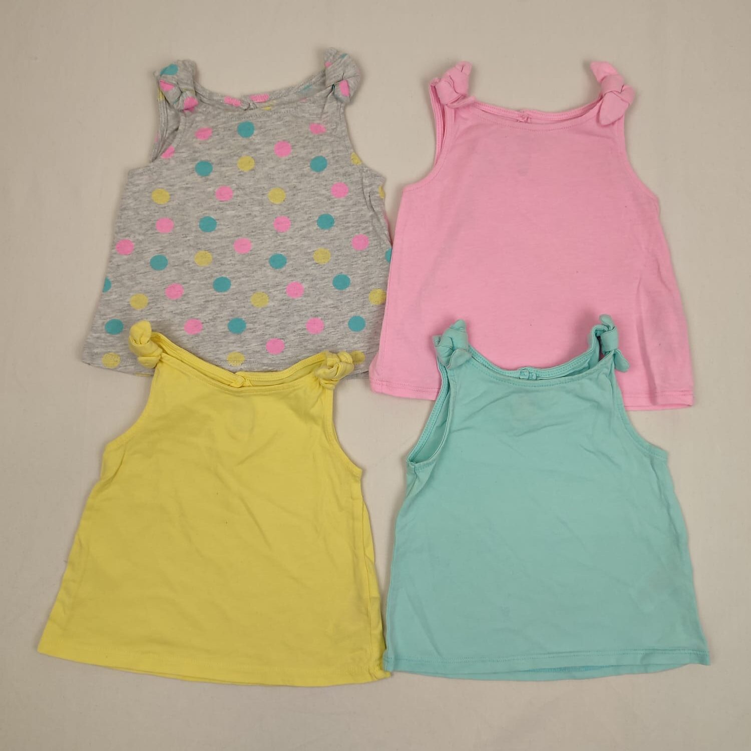 Autres commentaires : Lot de 4 t-shirts sans manches, avec noeud noué au niveau des épaules, fermeture par 1 bouton en haut du dos : – 1 vert aqua. -1 jaune. – 1 gris clair à pois roses et jaunes et turquoise. – 1 rose bonbon.