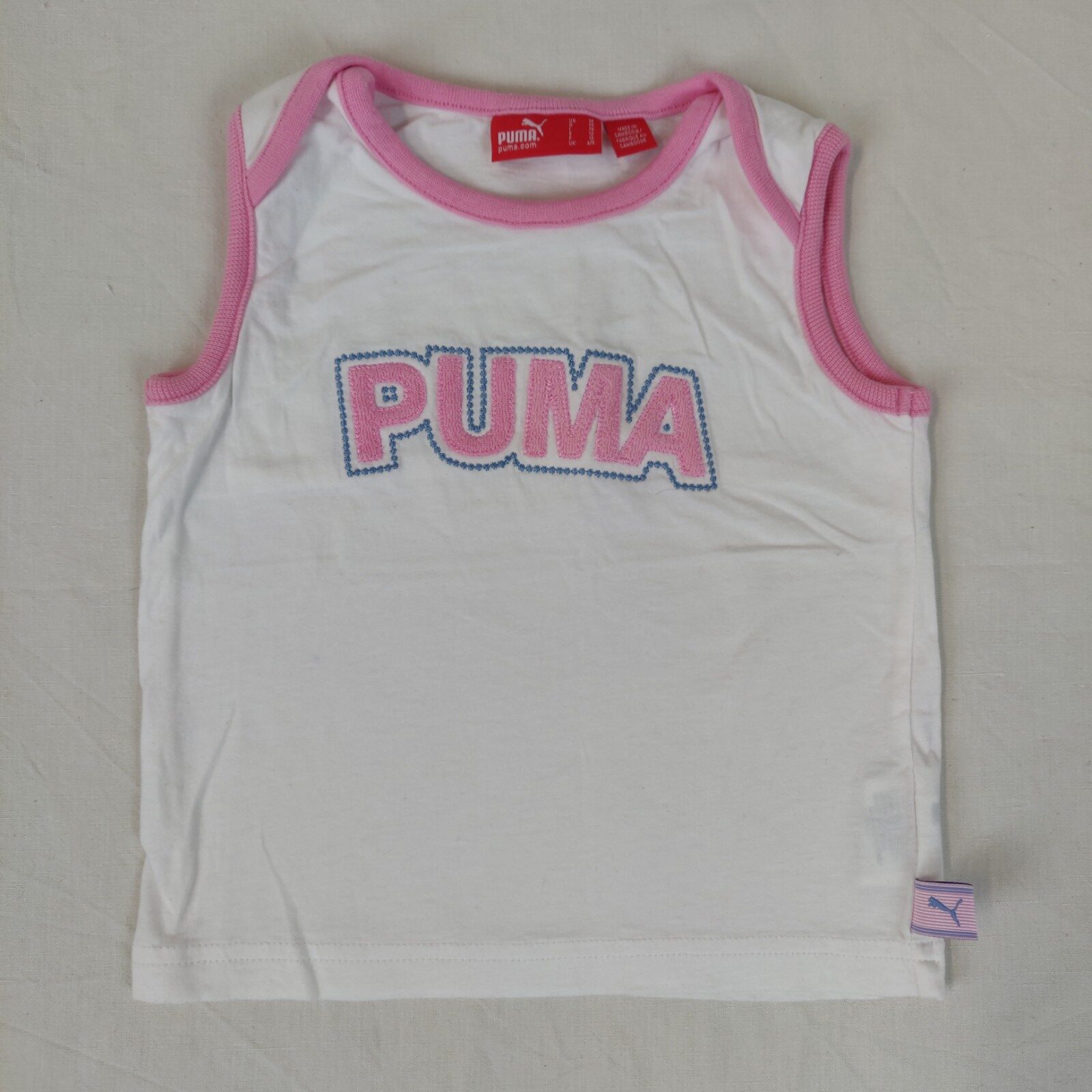 Autres commentaires : Débardeur – blanc avec liseré rose au niveau du col et des manches. Inscription centrale piquée rose et bleue « Puma ».