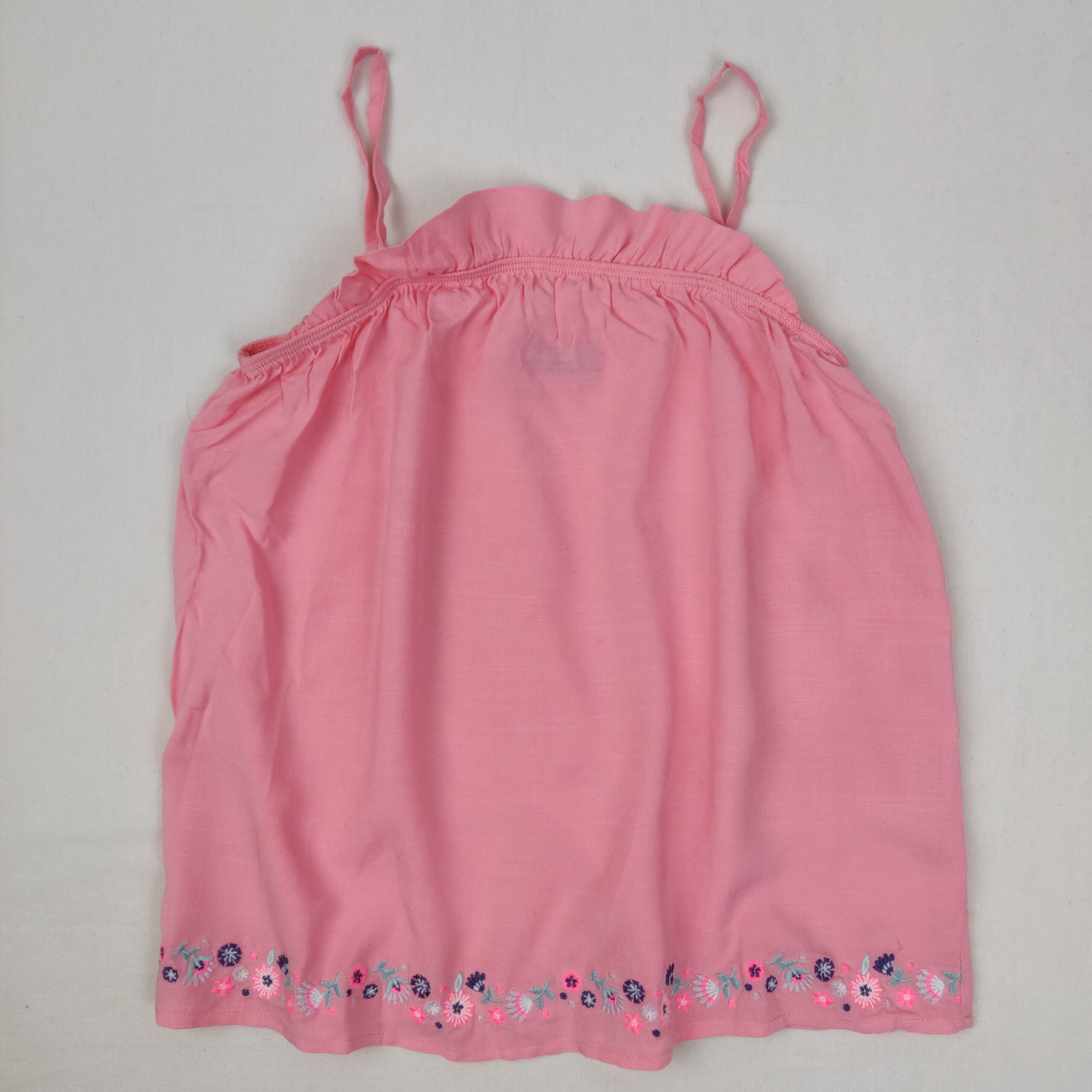 Autres commentaires : Haut à bretelles à longueur ajustable, uni corail avec élastique au niveau du haut du torse. Petits volants au torse, et broderies à la taille.