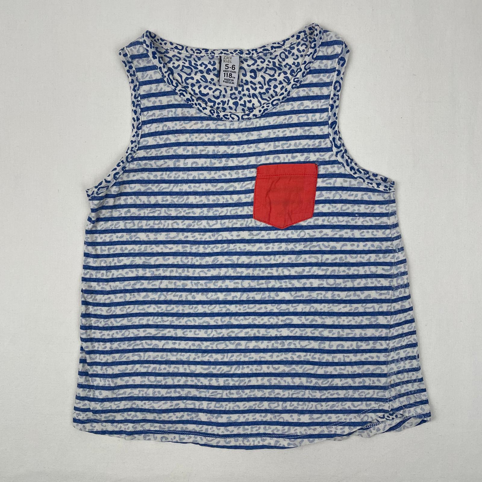 Autres commentaires : Débardeur gris rayé bleu avec imprimés par transparence motif leopard bleu. Poche de poitrine orange. Petite tâche orange au milieu du dos