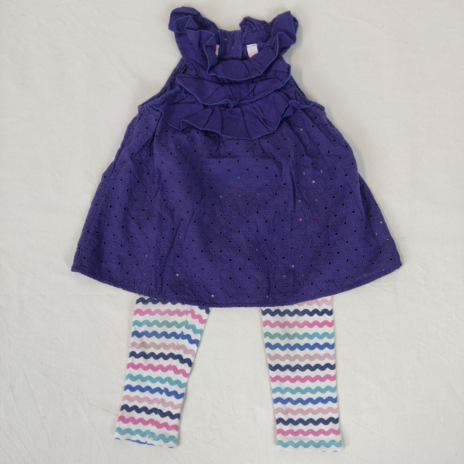 Autres commentaires : Tunique à bretelles – violet. Partie centrale volantée. Motifs broderies anglaises. Ouverture centrale au dos à boutons. Un legging Okkie Dokie rayé multicolore offert. Reprises au niveau des deux genoux.