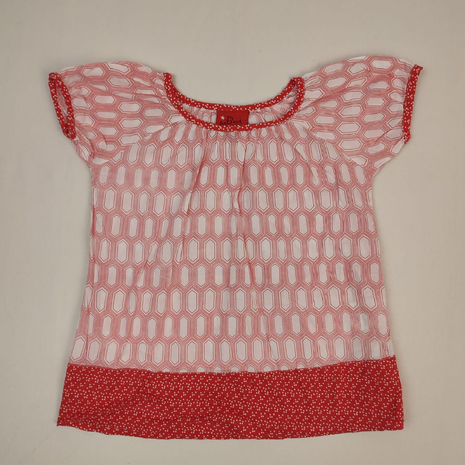 Autres commentaires : Tunique manches courtes rouge et blanche, col rond, motifs géométriques manches ballon.