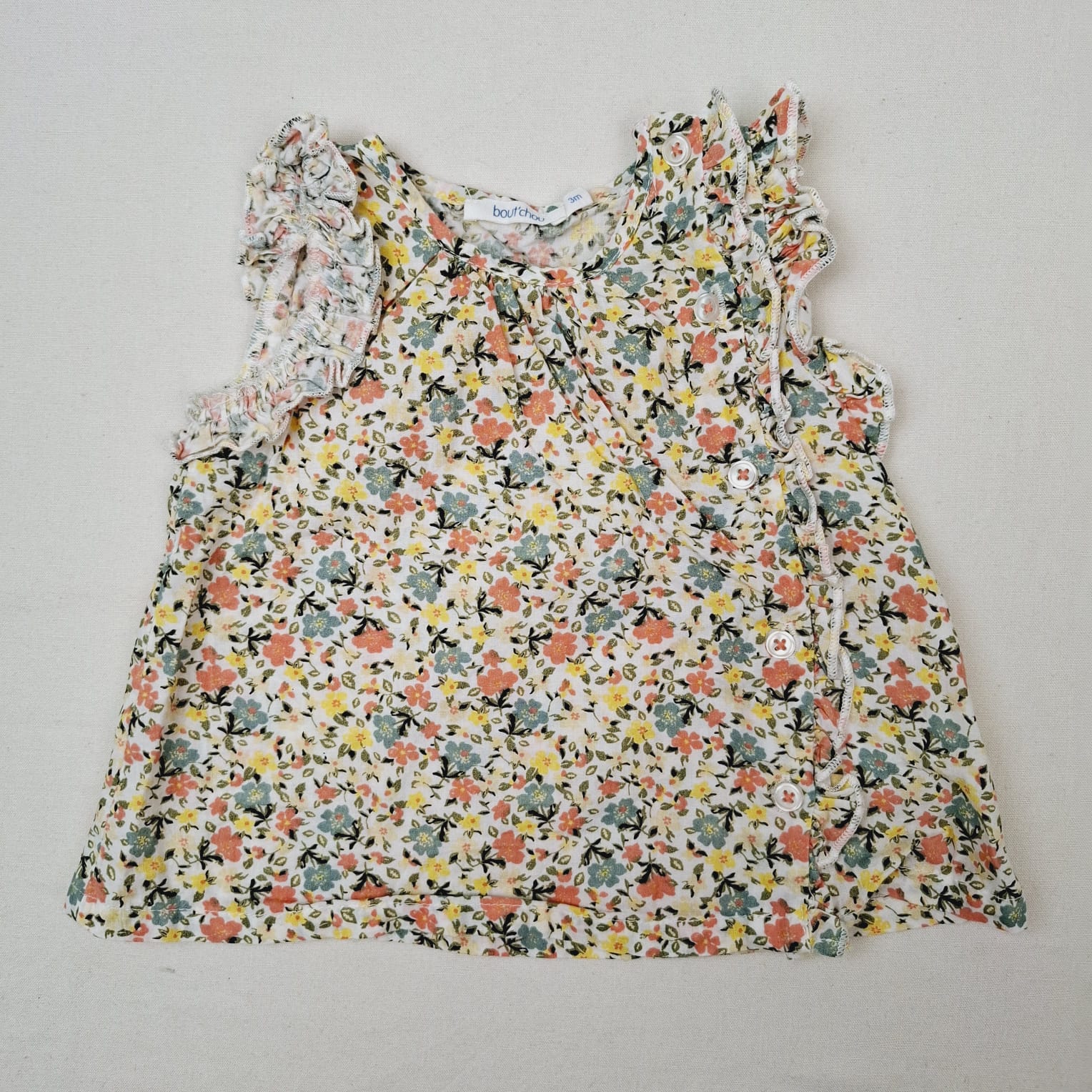 Autres commentaires : Tunique sans manches, blanc imprimé fleuri jaune, rose et gris vert, volanté aux épaules et au niveau de la boutonnière, fermeture devant latérale gauche par petits boutons
