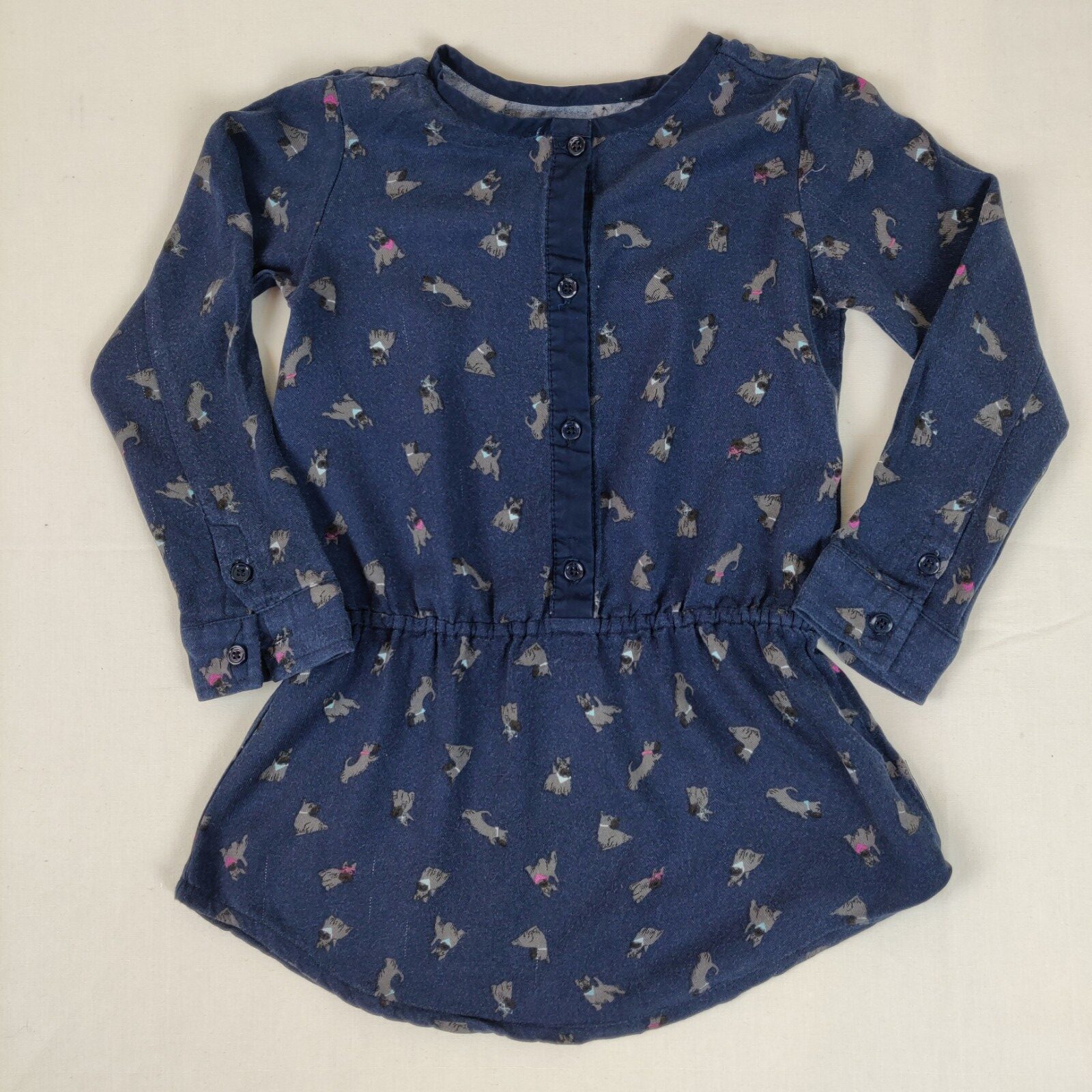 Autres commentaires : Tunique à manches longues – bleu foncé avec motifs chiens marrons. Ouverture centrale à 4 boutons classiques nacrés. Taille élastique. Ouverture aux poignets à 2 boutons classiques. Quelques fils tirés.
