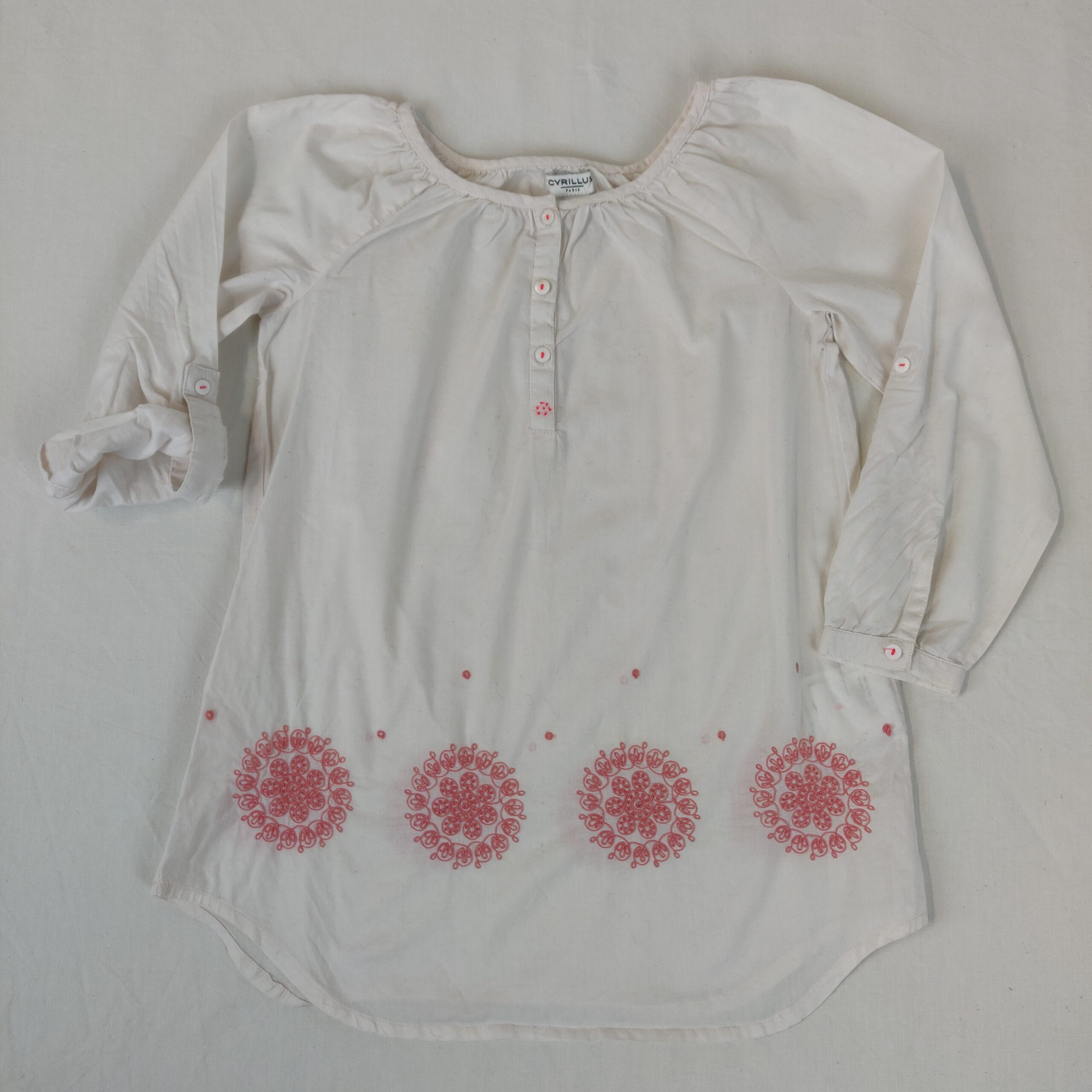 Autres commentaires : Tunique à manches longues – blanc cassé avec motifs géométriques cousus roses dans le bas. Ouverture centrale à 3 boutons. Manches retroussables. Légères tâches jaunes sur le devant. Niveau réduit de fraise à myrtille.