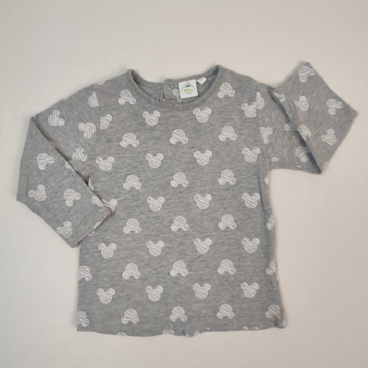 Autres commentaires : Tunique manches longues grise motifs têtes blanches de Mickey Mouse, col rond, fermeture par boutons pression au dos.