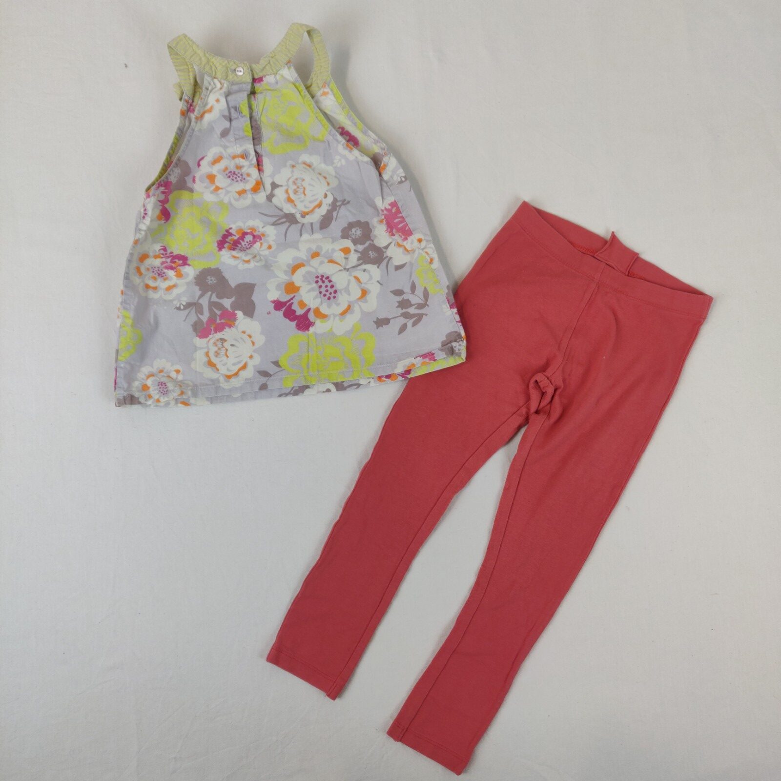 Autres commentaires : Tunique à bretelles – gris clair. Motifs floraux multicolores. Col et bretelles gris rayés jaune avec un noeud assorti décoratif. Ouverture centrale au dos à 3 boutons. Usure normale. Un legging orange Kiabi offert avec une mini tâche d’encre bleue au devant.