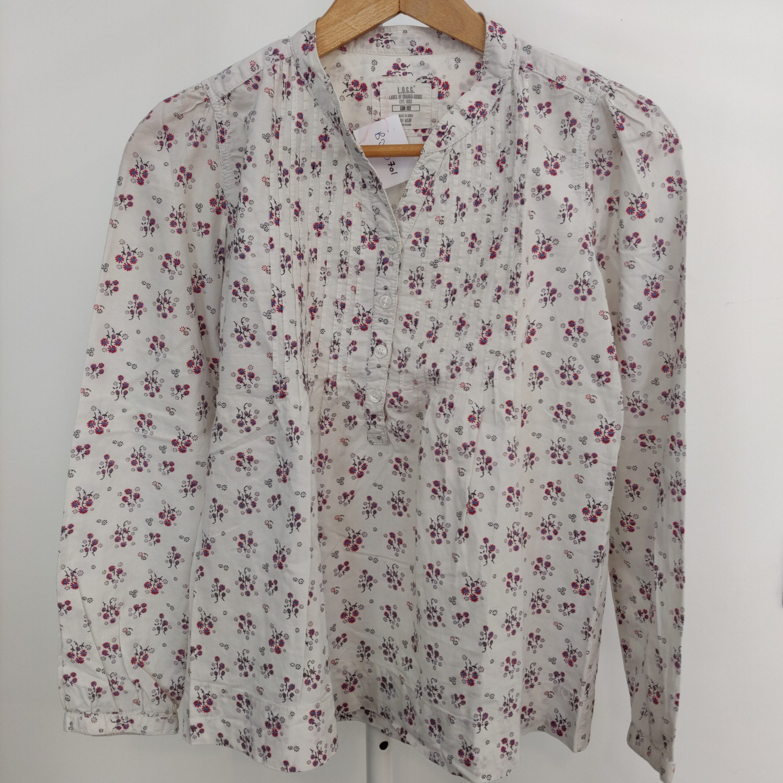 Autres commentaires : Chemisier tunique fond blanc et fleurs bordeaux et bleues, manche droite un peu usée au coude (motif un peu délavé) et petit trou réparé.
