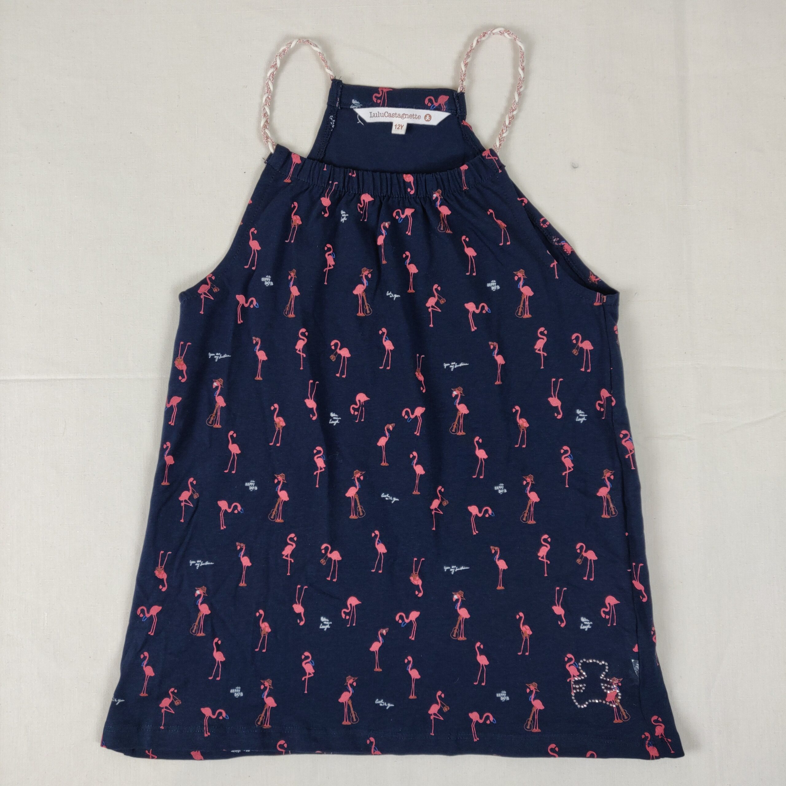 Autres commentaires : Tunique à bretelles tressées (blanc et rouge brillant) – bleu marine – motifs flamands roses se répétant.
