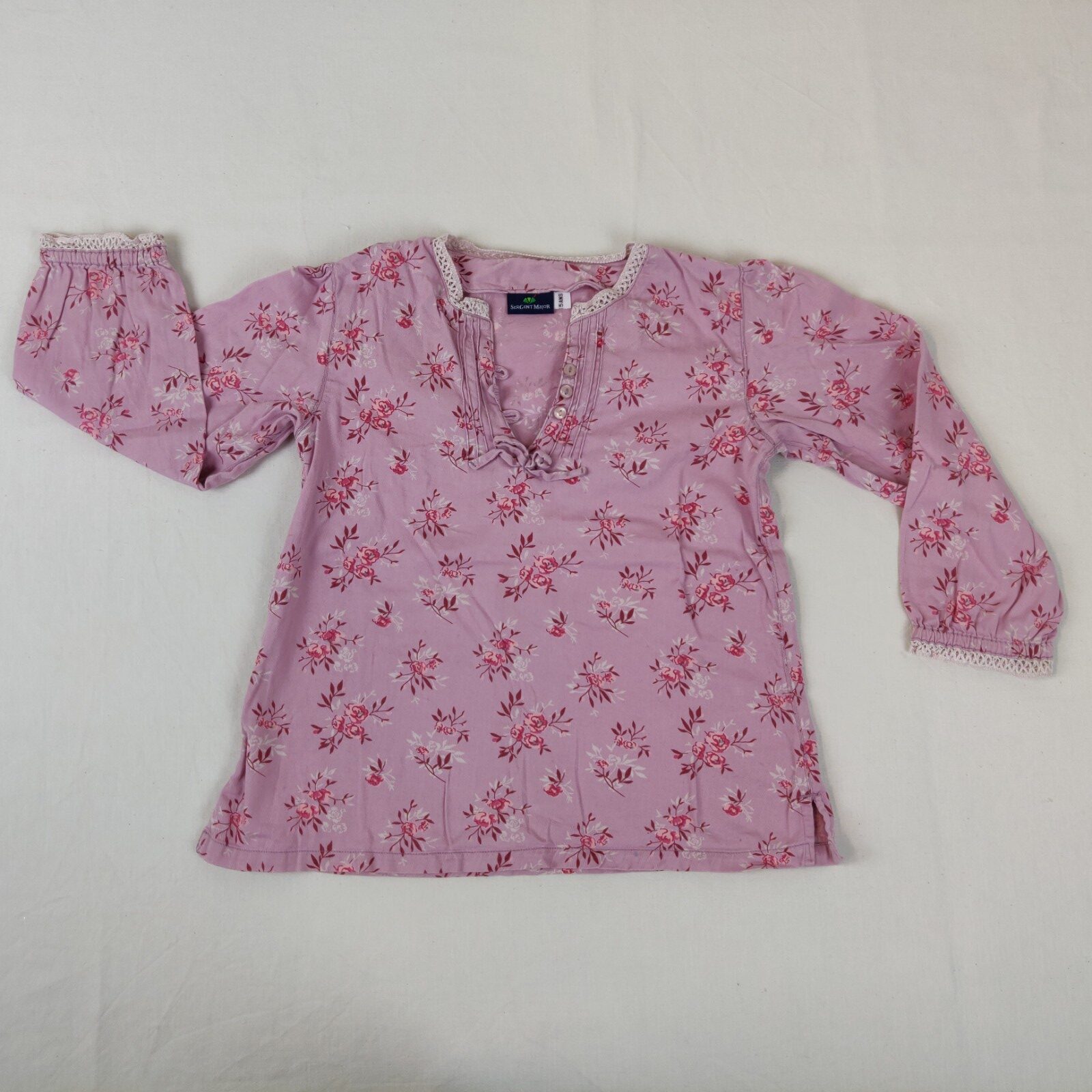 Autres commentaires : Tunique rose avec fermeture à boutons à l’avant et motifs de fleurs violet.