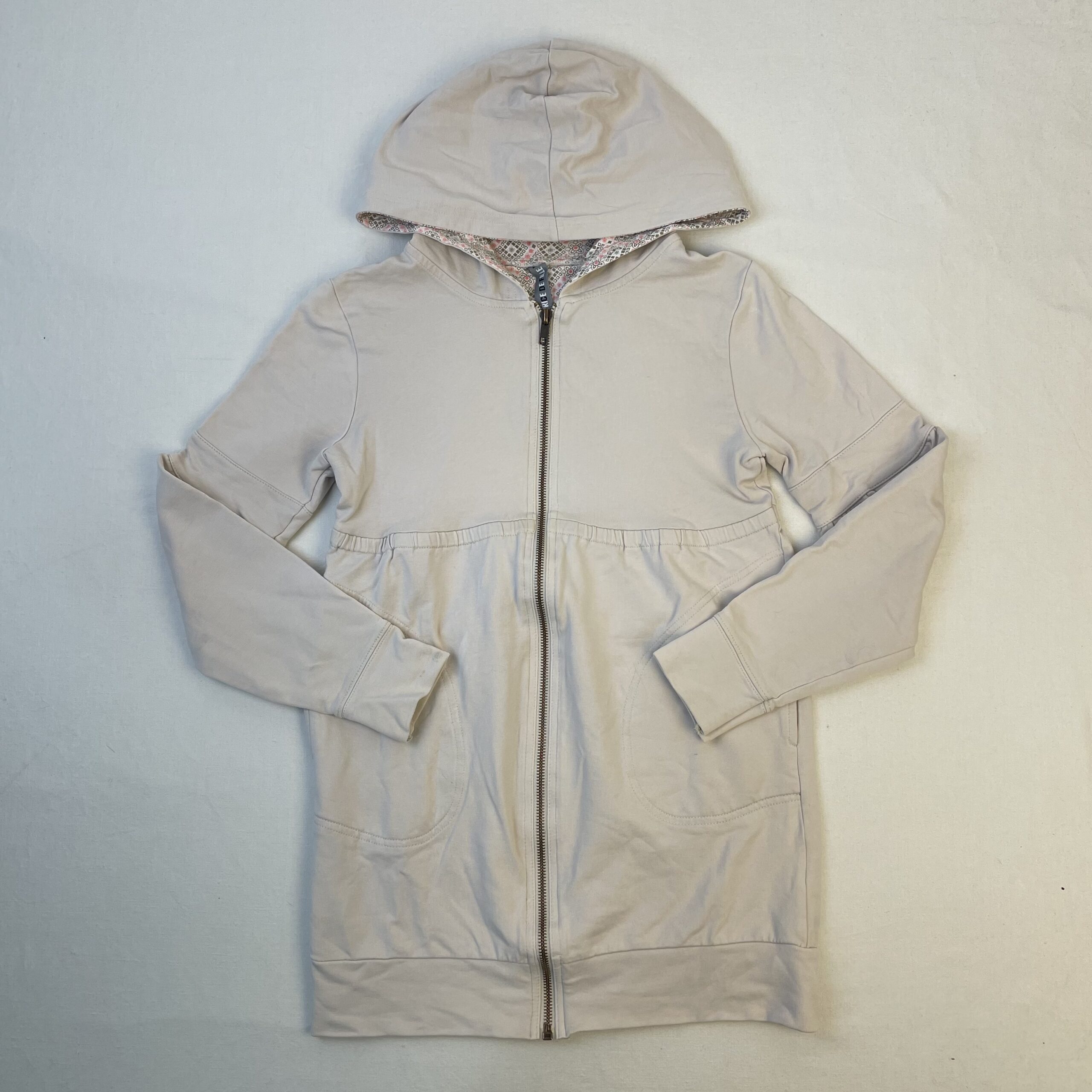 - Veste beige longue et légère zippée, à capuche, taille élastiquée