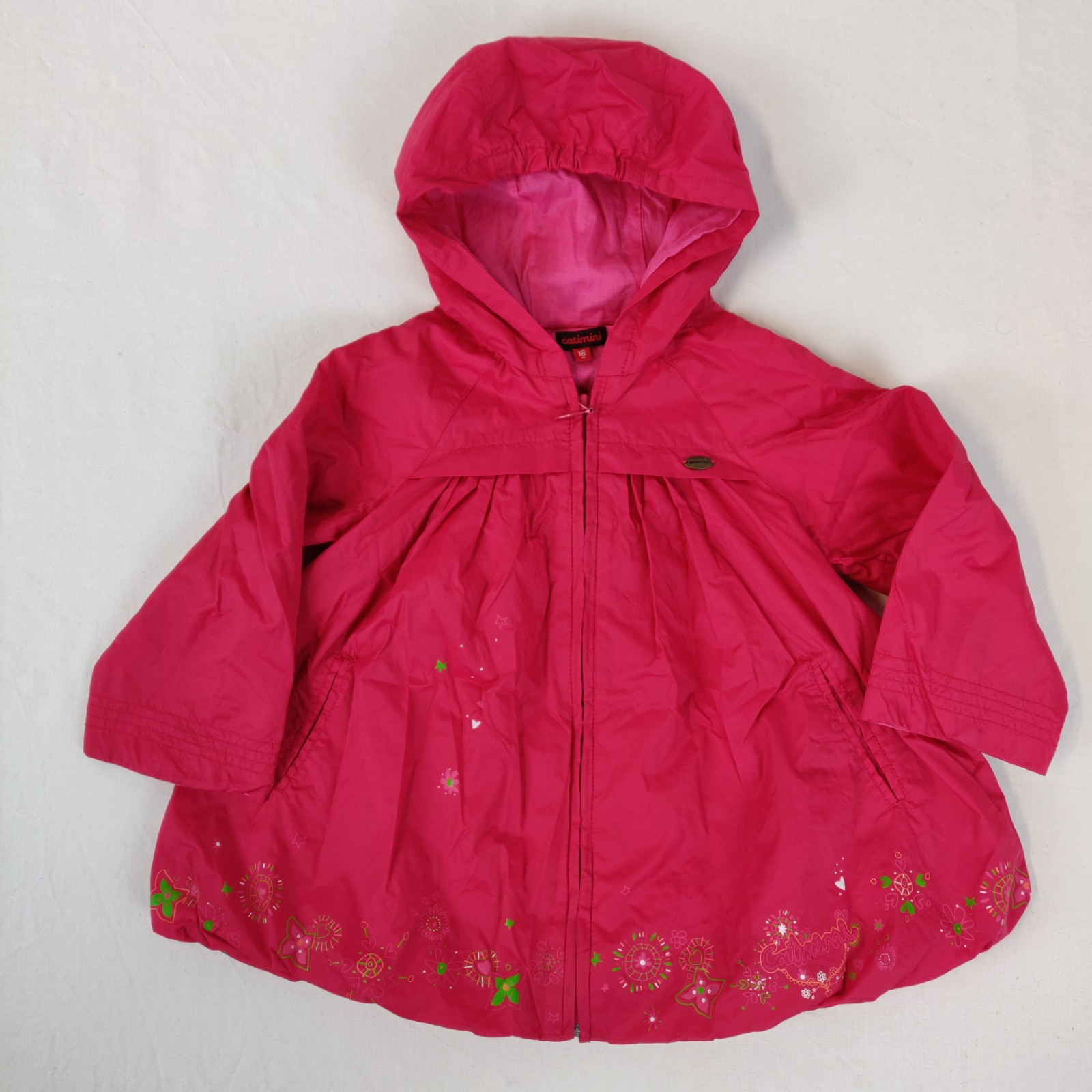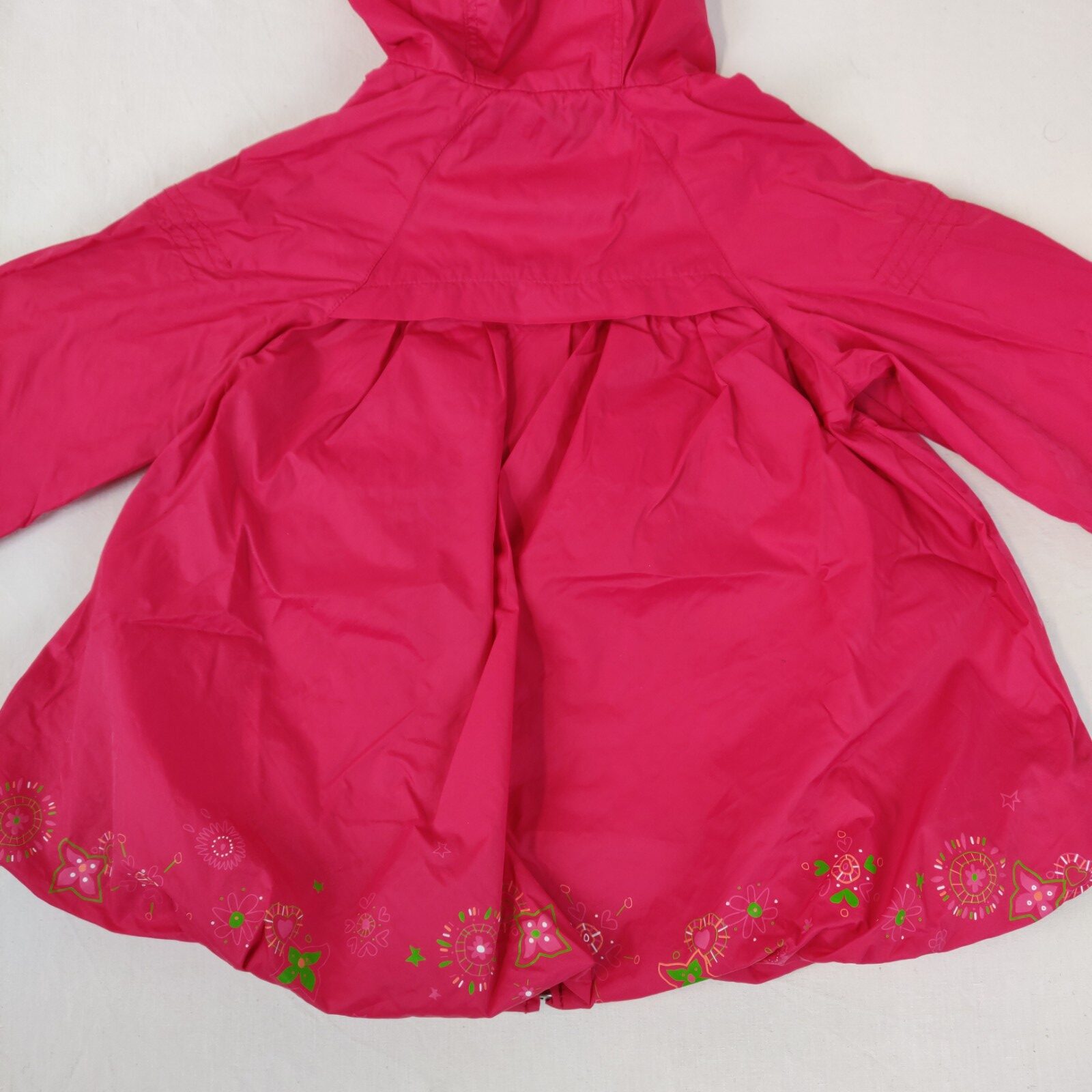 Autres commentaires : Veste de pluie à capuche finement doublée – rose fushia. Motifs floraux vitaminés au nivau de la taille. Ouverture centrale zippée. 2 poches latérales. Ecusson métallique central de la marque. La doublure est légèrement tâchée.