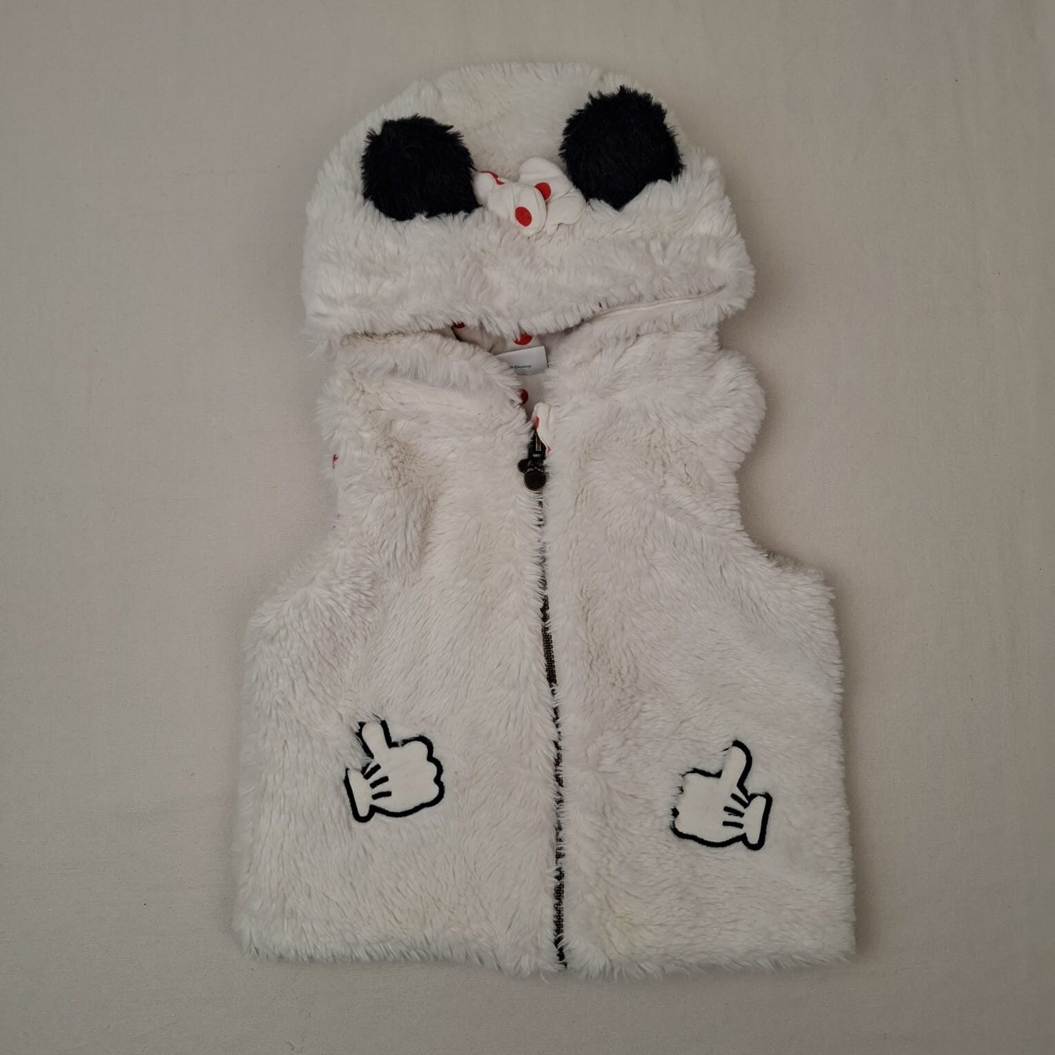 Autres commentaires : Veste à capuche sans manches en fourrure artificielle toute douce blanc, doublure 100% coton avec imprimé pois rouges, capuche avec noued et oreilles en relief, fermeture devant par zip, inscription « MINNIE » brodée marron au dos.
