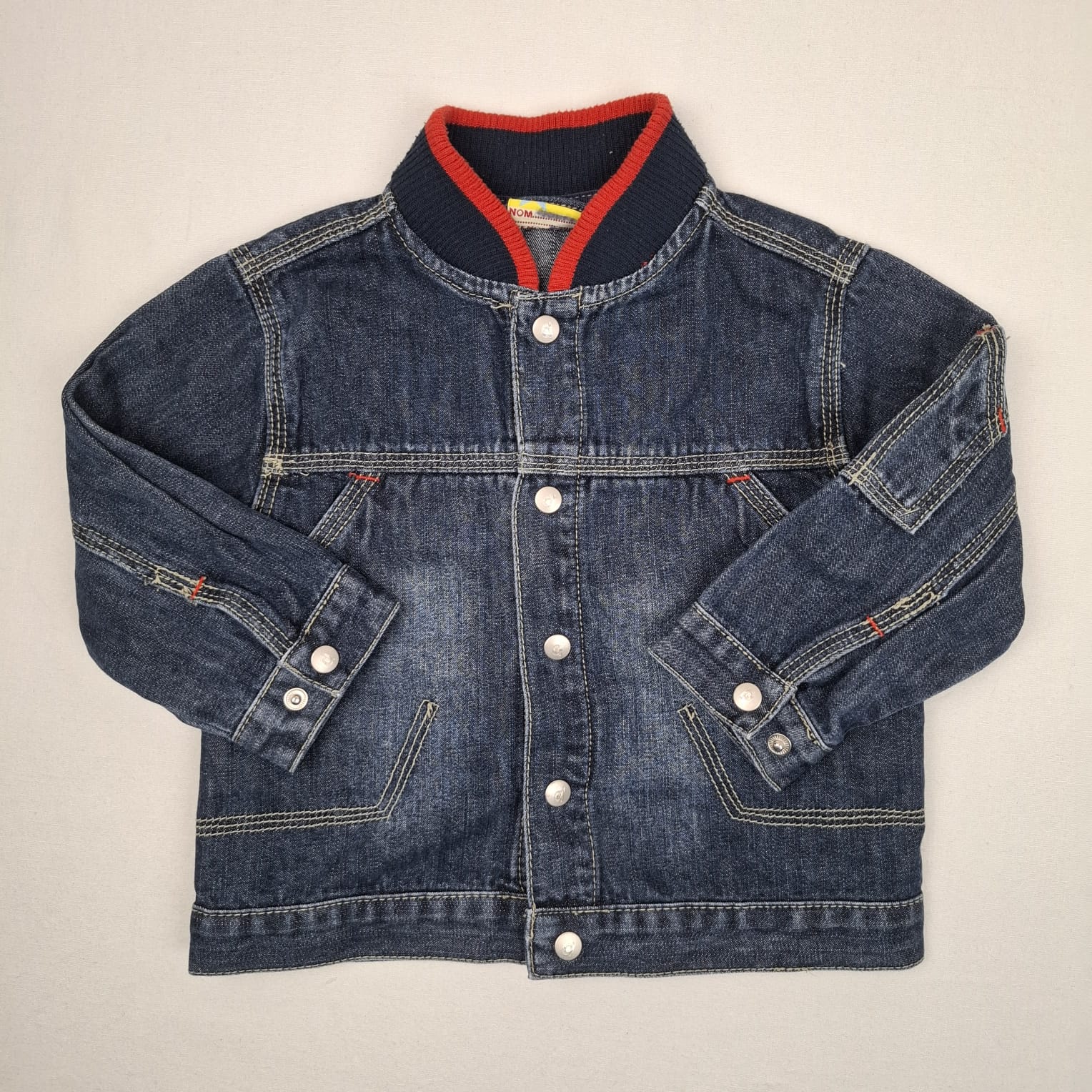 Autres commentaires : Veste en jean bleu, Du Pareil Au Même, fermeture à bouton pression, illustration Cirque sérigraphié à l’intérieur de la veste, col noir et rouge, flocage légèrement décolé au dos