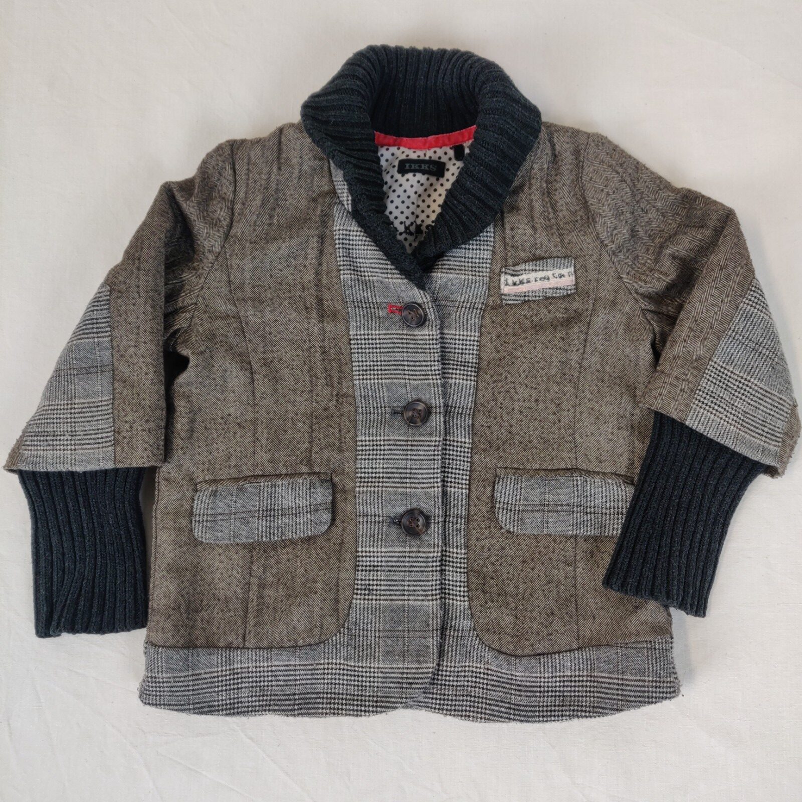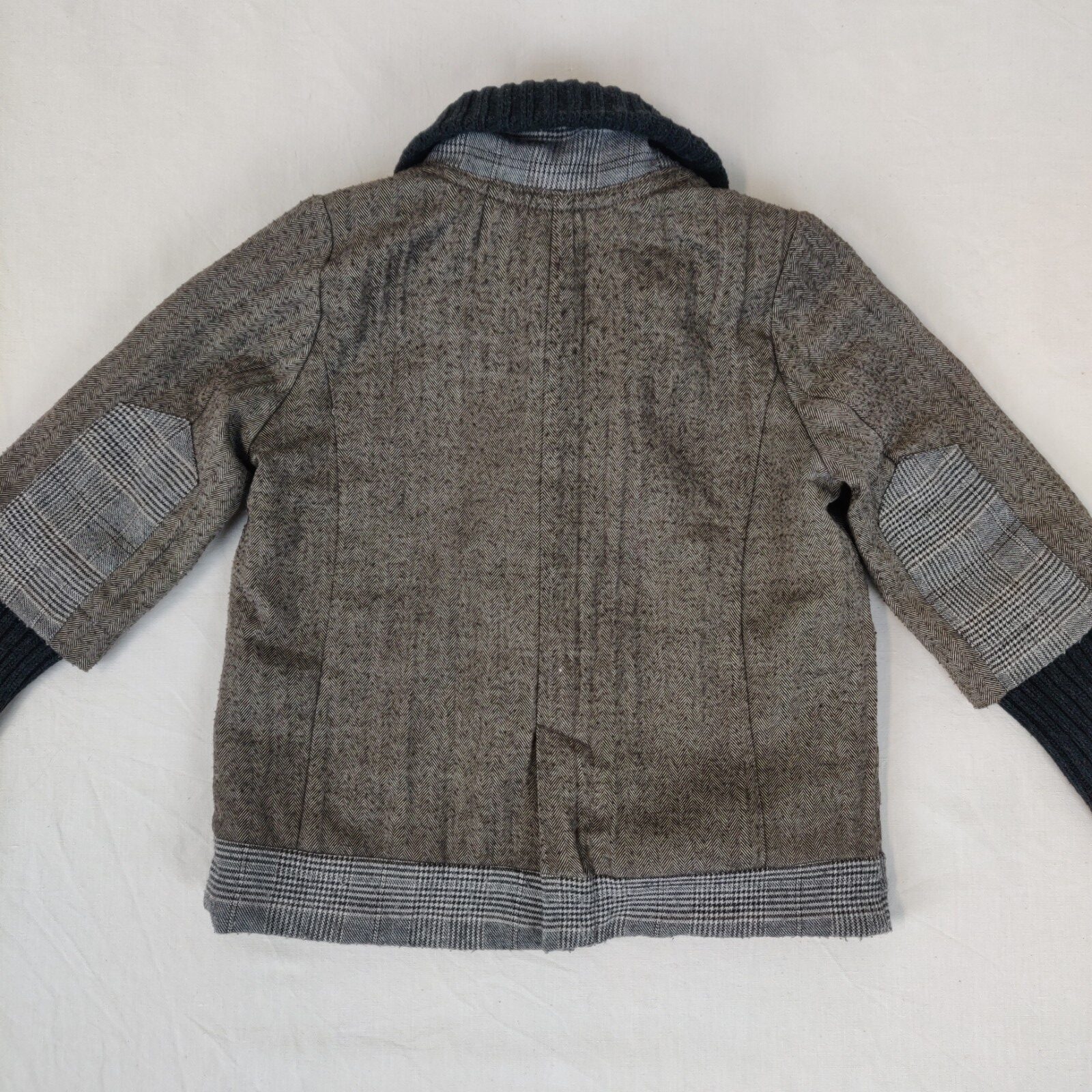 Autres commentaires : 35% rayonne. Veste légèrement doublée marron à motifs chevrons. Ouverture centrale à boutons. L’ouverture, les poches et la taille sont en tissu écossais gris et marron. Le col et les poignets sont en tricot élastique gris foncé. Pochette centrale avec griffe de la marque. Usure normale du vêtement.