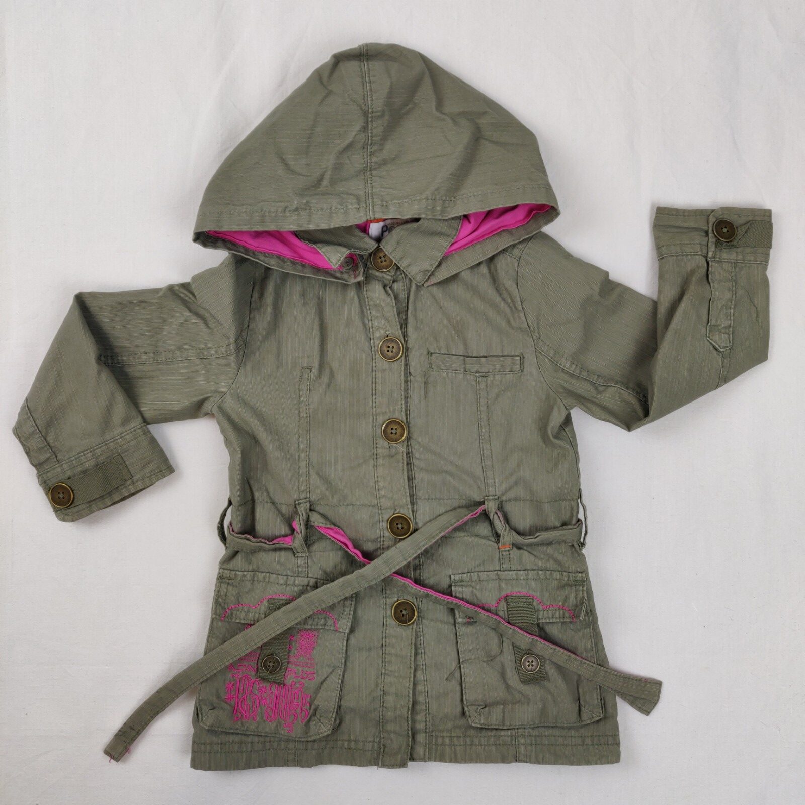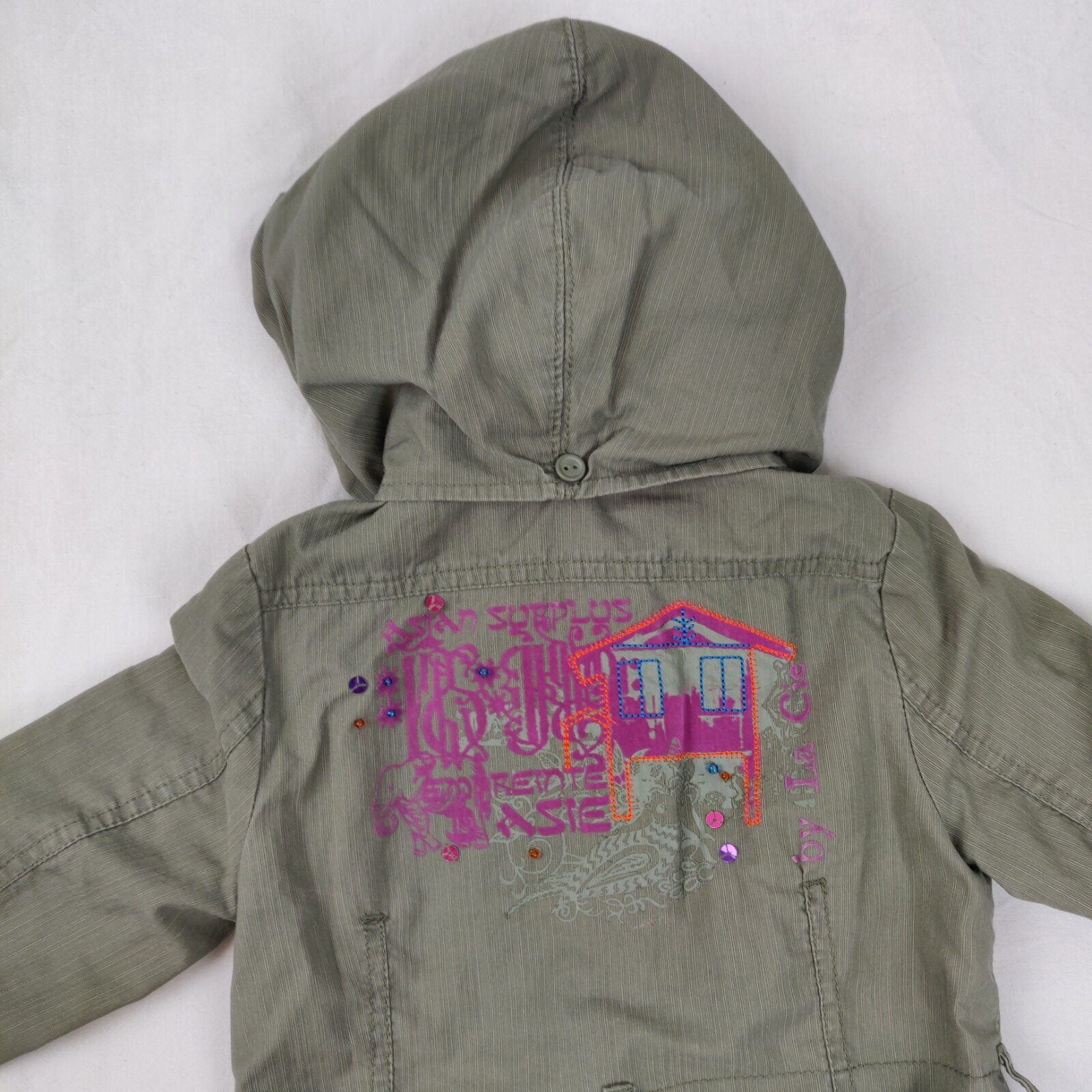 Autres commentaires : Veste manches longues vertes avec capuche amovible, une fermeture par boutons devant et par cordon au niveau de la taille.