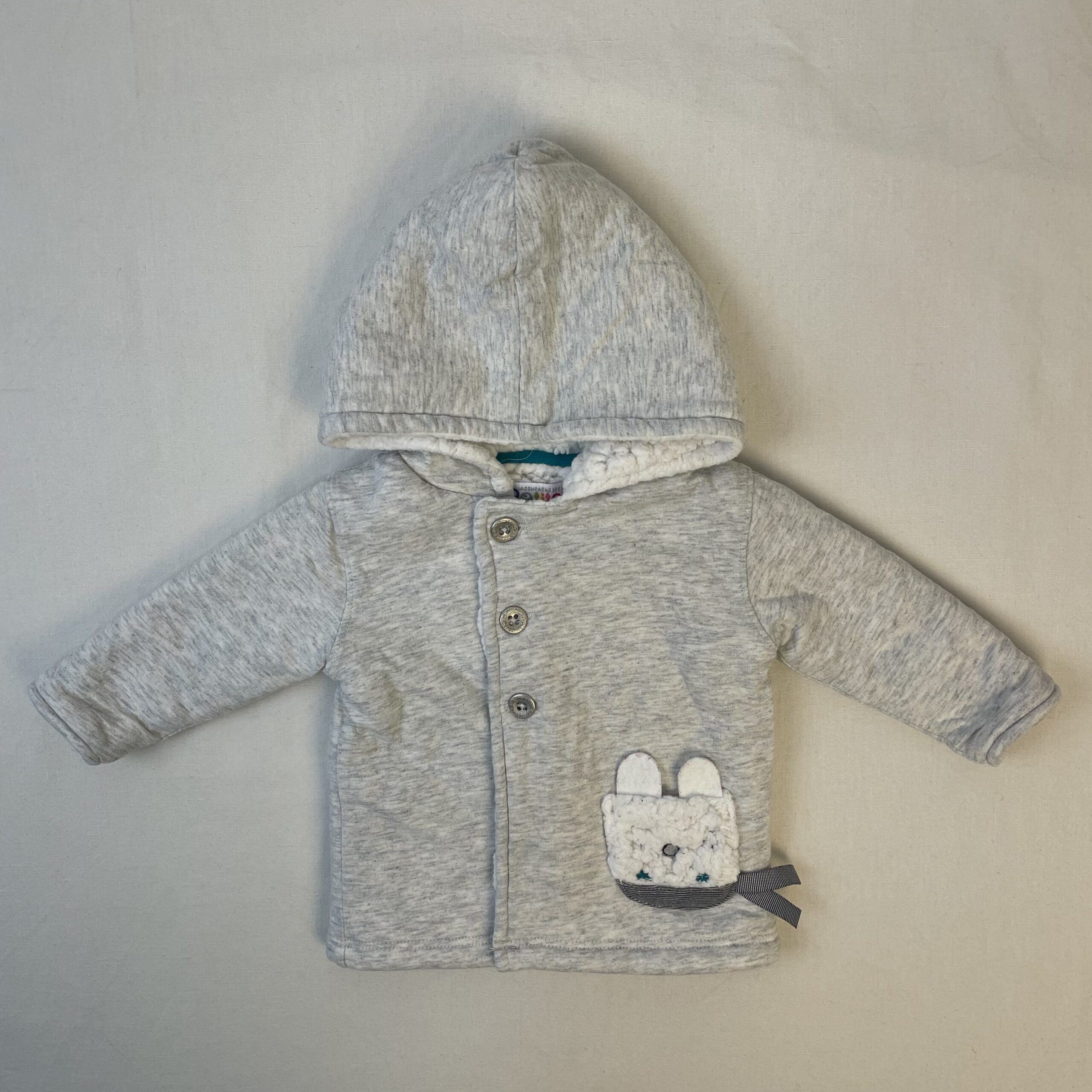- Veste à capuche couleur grège, fermeture devant par boutons classiques, devant petite tête de lapin en fausse fourrure, doublure en fausse fourrure blanche style mouton (100% polyester).