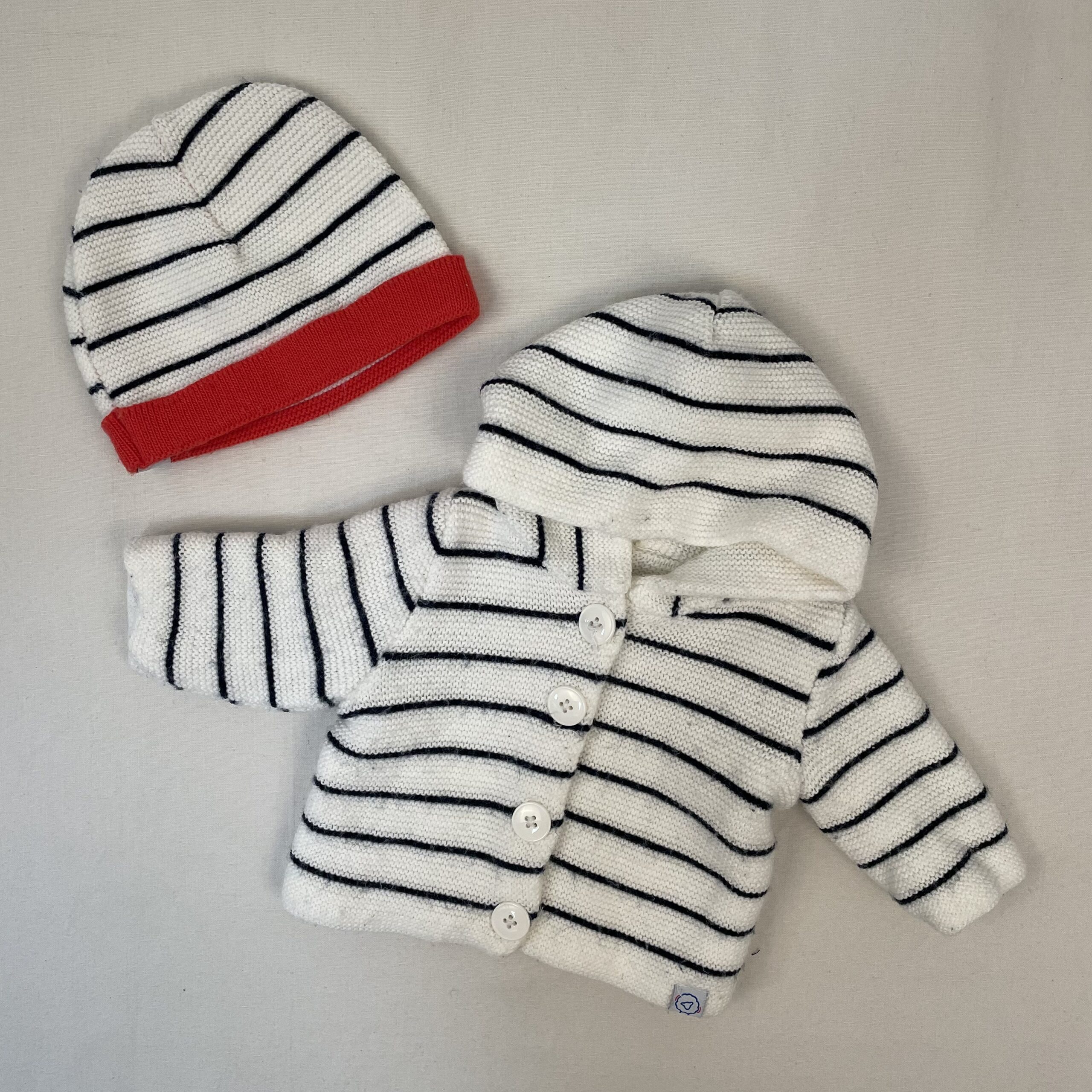 - Paletot réversible à capuche en tricot point mousse, côté écru à rayures bleu marine, côté écru uni (quelques peluches). Bonnet en tricot assorti écru à rayures bleu marine, rebord orange corail, 100% acrylique. Taille 1-3 mois.