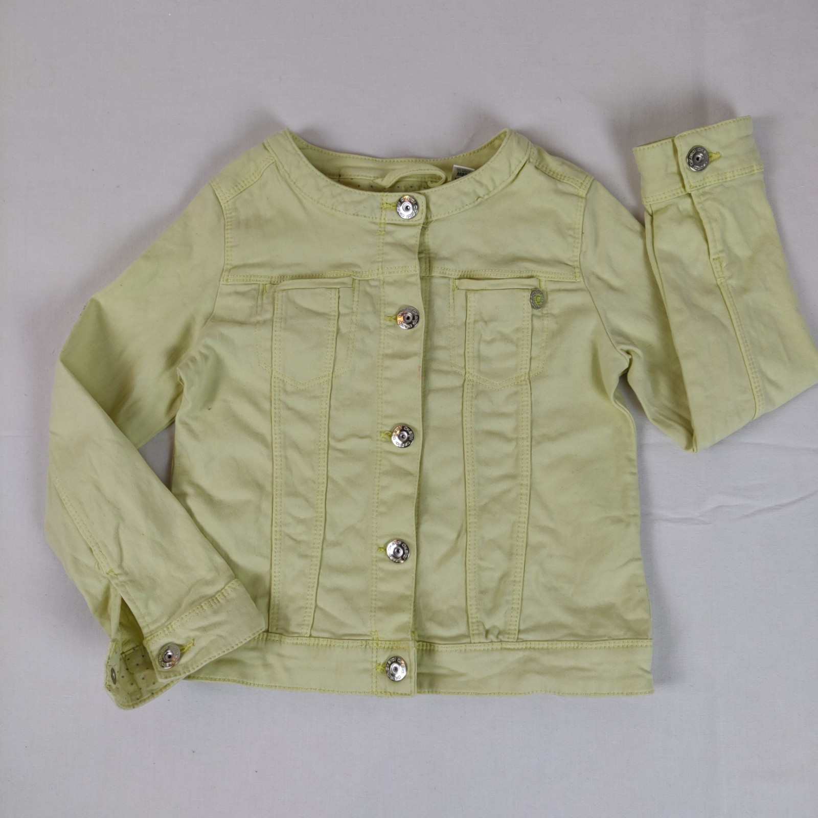 Autres commentaires : 2% élasthanne. Veste en denim jaune, col rond, fermée par boutons presson. En parfait état sauf un petite trace rosée sur la tranche de la boutonnière et de discrètes traces noires sur le dos de la manche droite.