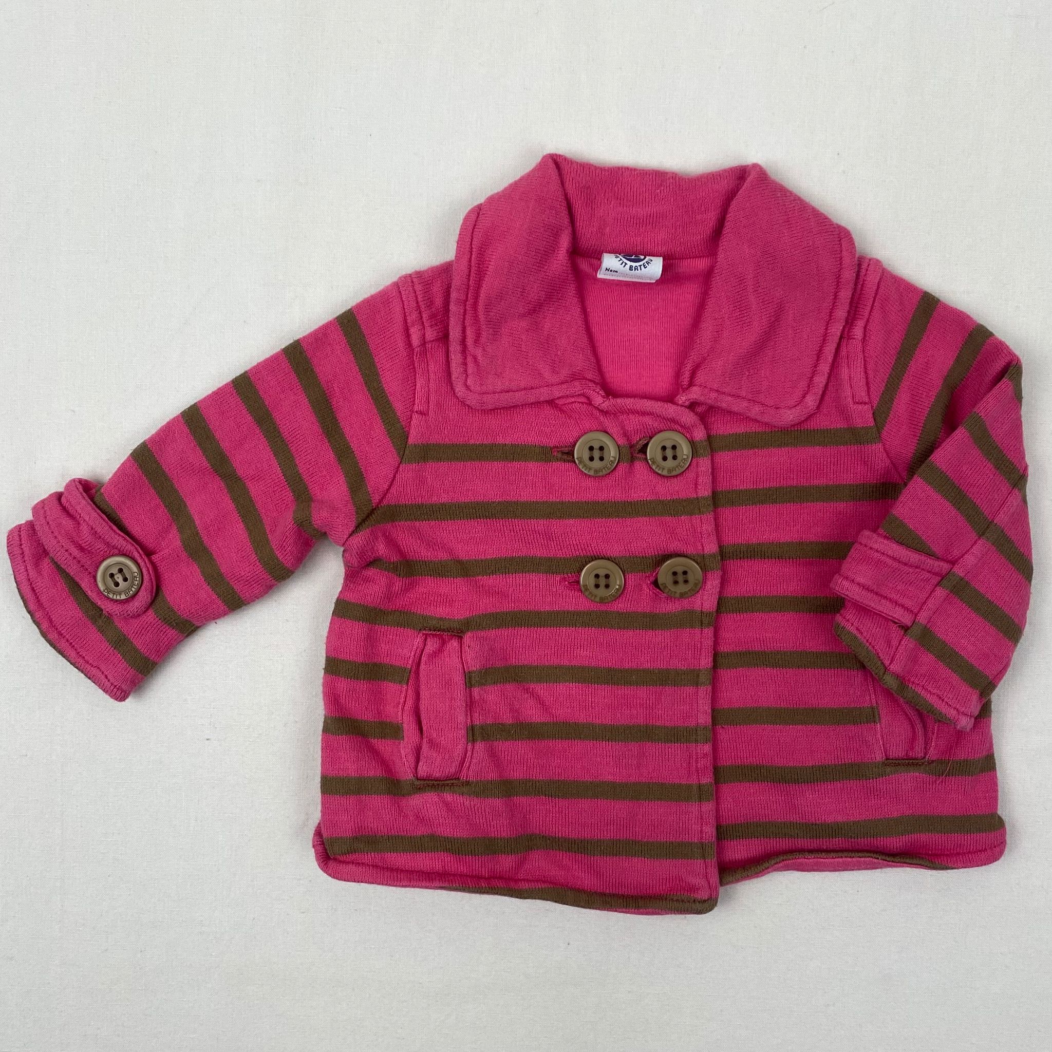 Veste-gilet en maille rose rayé vert kaki, avec col plat et large rose uni, doublure en jersey de coton uni rose, fermeture par 4 boutons classiques devant juste en dessous de l’encolure, patte de boutonnage décorative sur chaque manche.