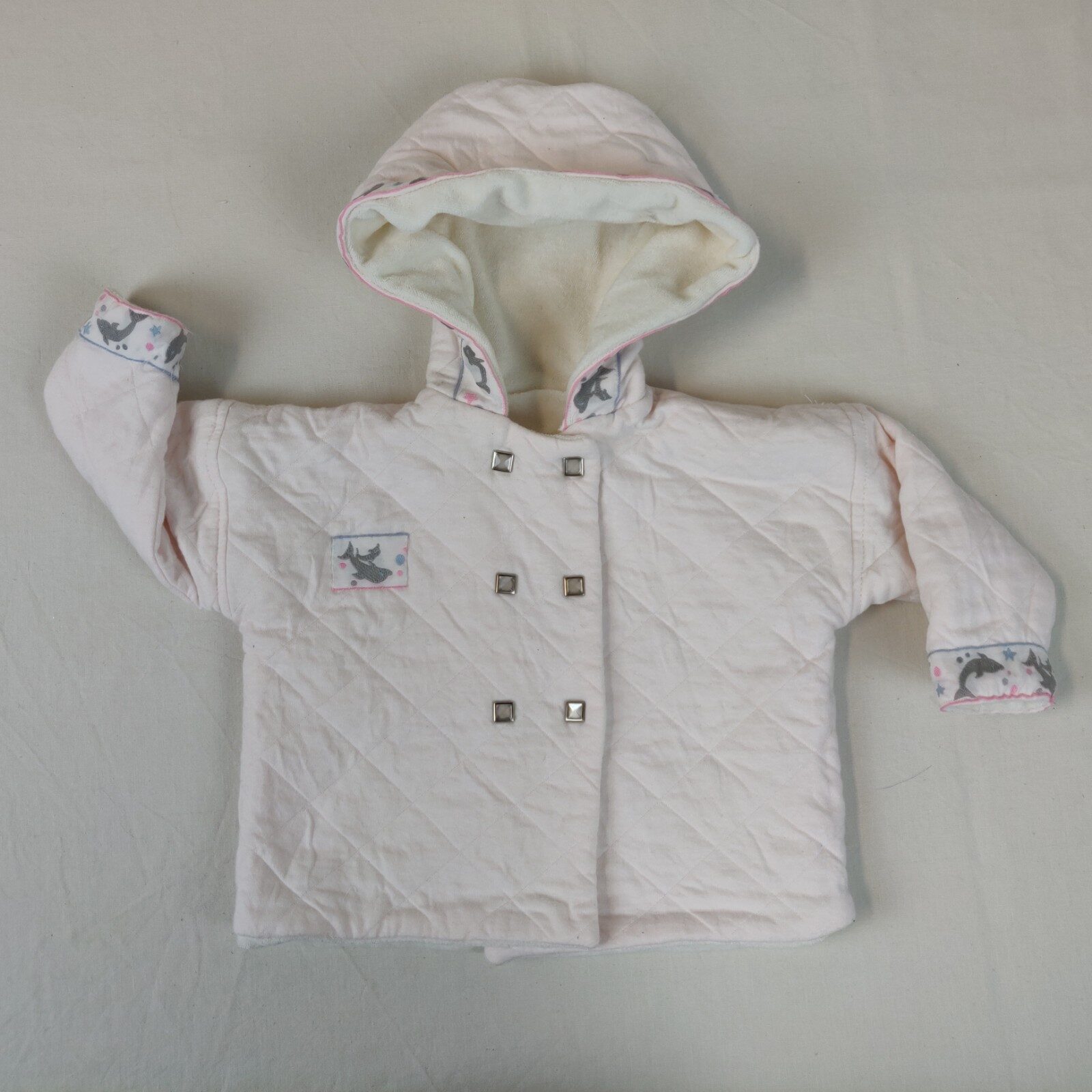 Autres commentaires : Veste rose sans marque à double fermeture à boutons pression et avec doublure. Petite tâche beige à l’intérieur du col
