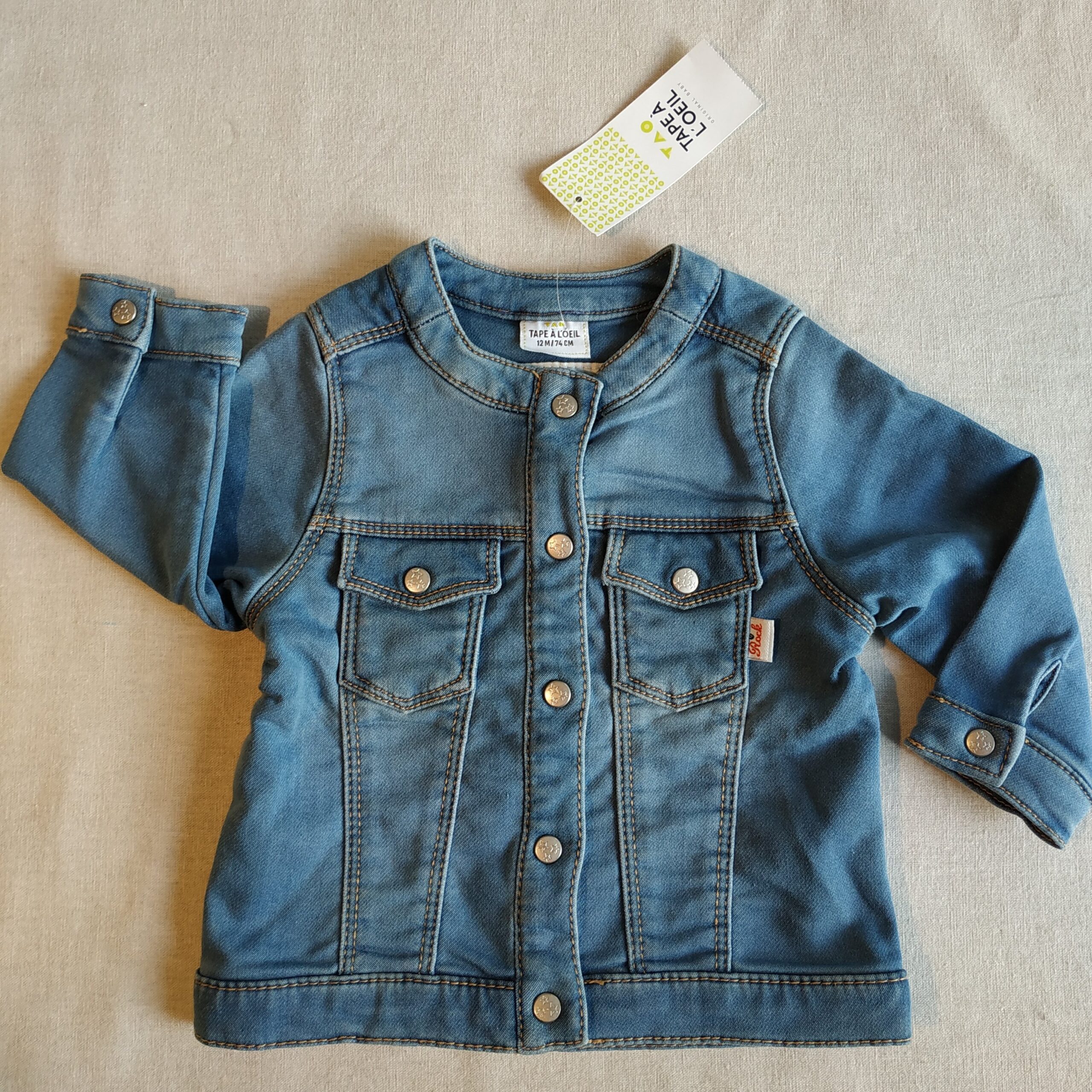 Autres commentaires : 26% polyester, 2% spandex. Veste denim à col rond, non doublée, coutures camel, boutons pression avec étoiles aux 2 poches à l’avant, aux poignets et pour fermer la veste.