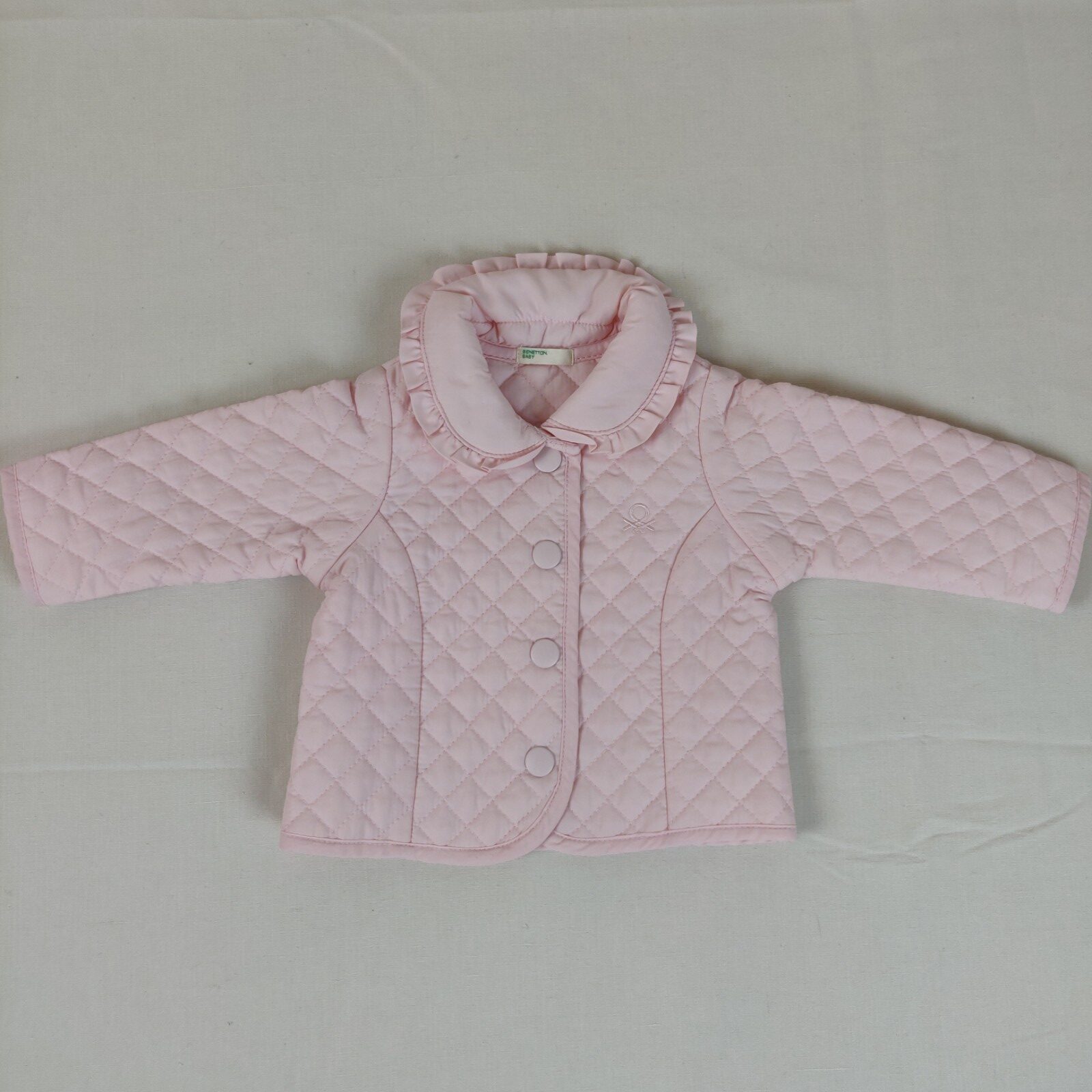 Autres commentaires : Veste matelassée – rose. Col claudine avec bordure froncée. Ouverture centrale à 4 boutons pression. Griffe de la marque centrale cousue.